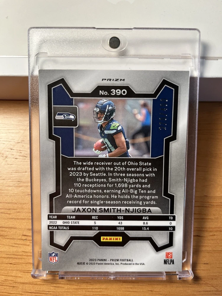 Type:Sports Trading CardCard Number:390Player/Athlete:Jaxon Smith-NjigbaSeason:2023Parallel/Variety:Silver MojoTeam:Seattle SeahawksManufacturer:PaniniSport:FootballFeatures:Rookie, Serial Numbered, Parallel/Variety, Short Print, HologramSet:2023 Panini PrizmPrint Run:400League:National Football League (NFL)Autographed:No