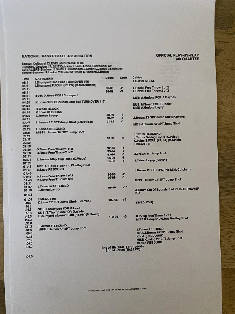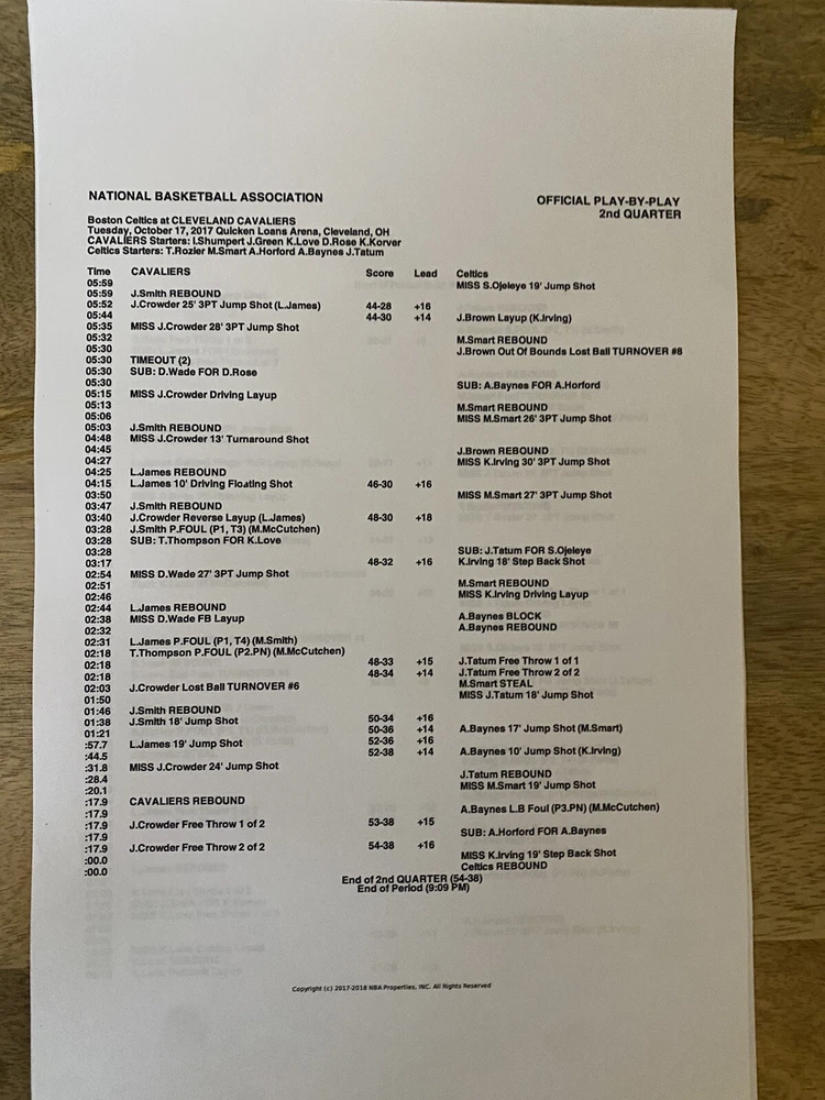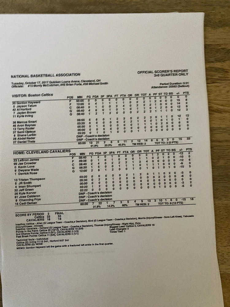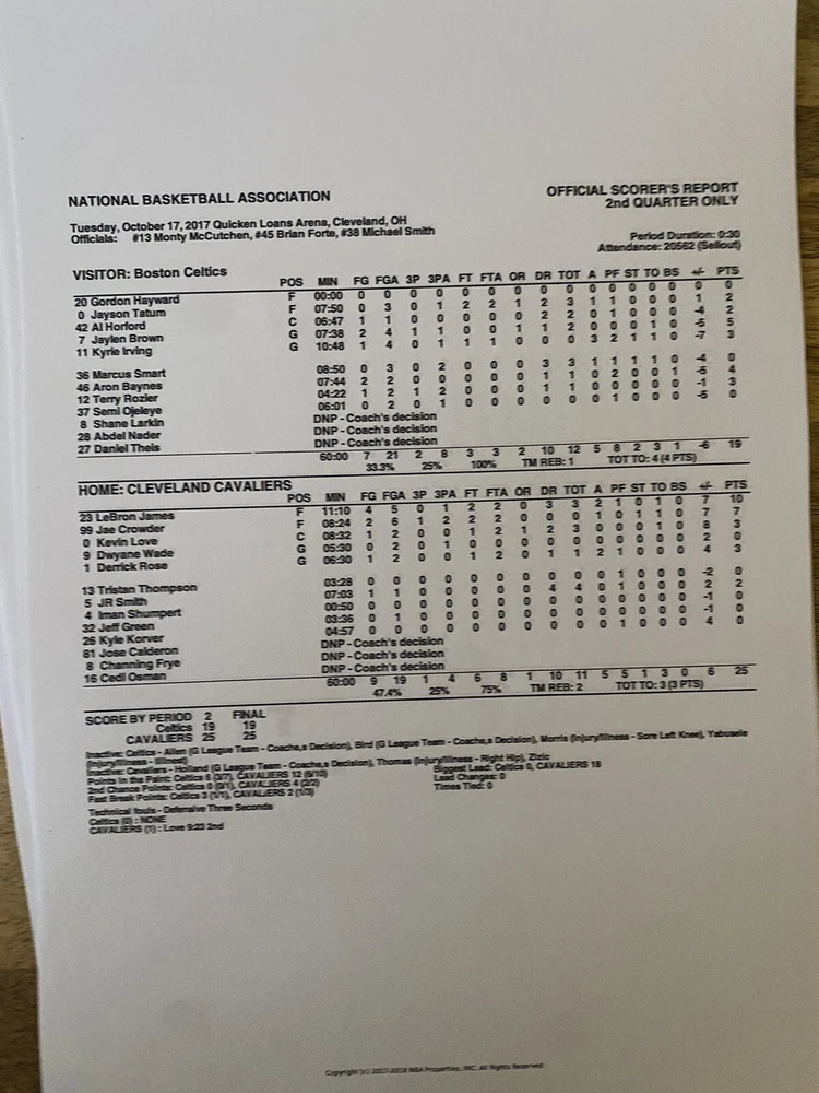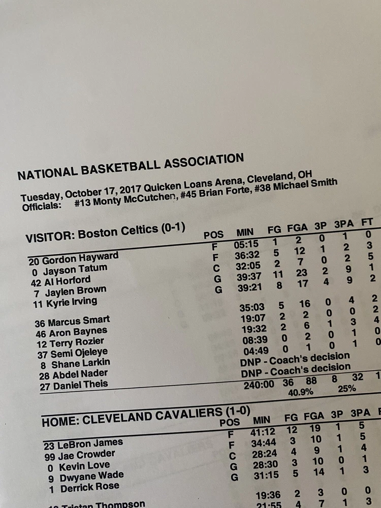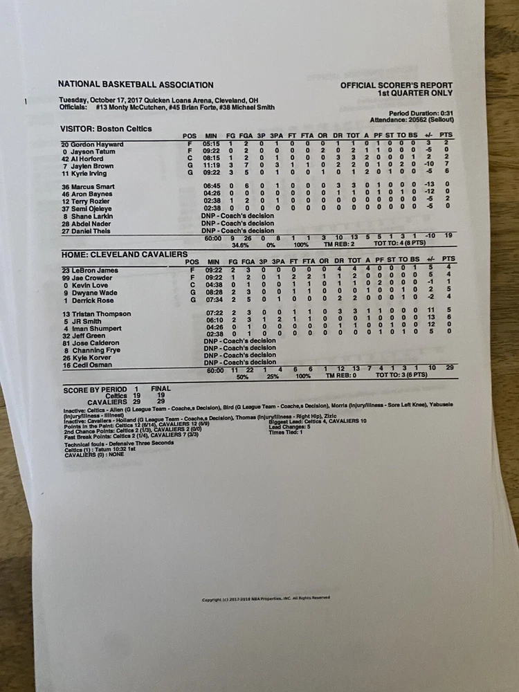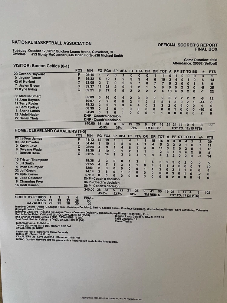 Jayson Tatums First NBA Game Authentic Official Scorer’s Report - from the game scorekeeper Date: 10/17/2017 Location: Quicken Loans Arena, Cleveland Ohio Teams: Celtics vs Cavs Pages: 16 Size: 8.5” x 14” media Comes with: 1. Official scorers game report 2. 11x17” rigid plastic protector
