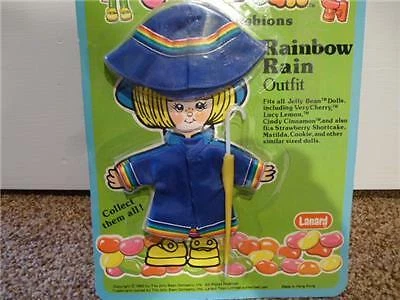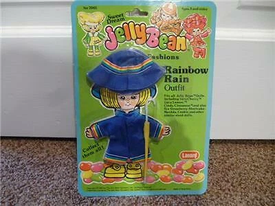 The Jelly Bean Rainbow Rain Outfit Doll from 1982 by Lanard is a green fashion set for a Jelly Bean fashion doll. The outfit is sealed and includes a colorful raincoat and matching accessories. This item is part of the Jelly Bean doll franchise and is suitable for fashion doll collectors.