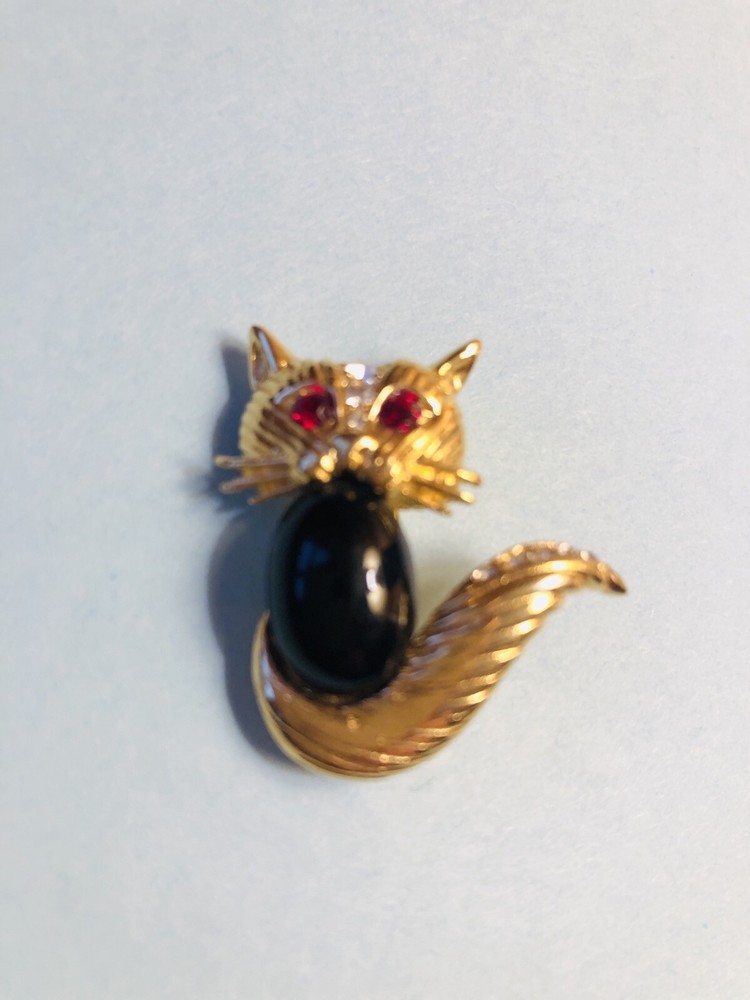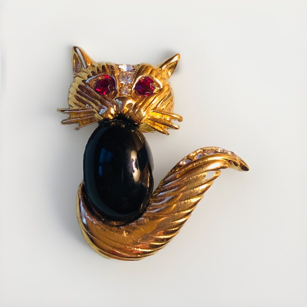 Adorn your outfit with a touch of vintage glamour with the SAO VTG MCM Gold Cat Brooch. This charming piece showcases a classic mid-century design, with a sleek gold finish that adds a warm, radiant lift to any ensemble. Its vibrant green eyes are highlighted by shimmering green rhinestones, creating a captivating sparkle that's sure to draw the eye. Crafted with attention to detail, the brooch features a delightful rhinestone collar that frames the cat's neck, offering an extra hint of elegance. Perfect for adding a sophisticated flair to your clothing or accessories, this brooch is a versatile addition to any jewelry collection, whether you're dressing up for a special occasion or accenting your everyday style.
