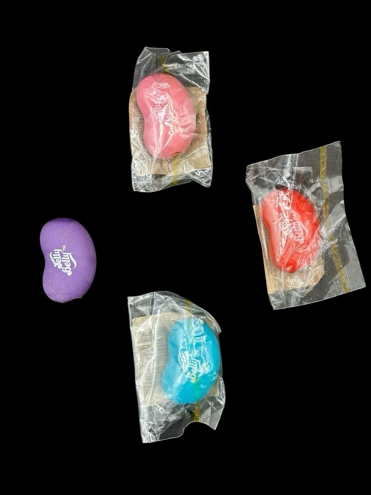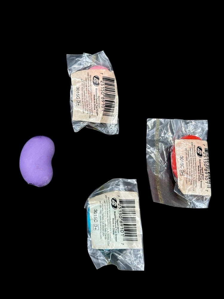 Jelly Belly Bean Scented Pencil Toppers Fragrant Purple Pink Red Blue These are all very fragrant. Some of the baggies have lost their stickiness so don’t seal. The purple bean does not have a bag. It also has a spit on the tip. See pics. About 1 1/2” long