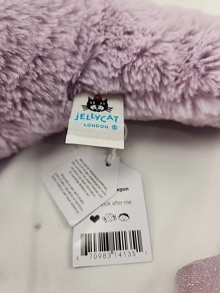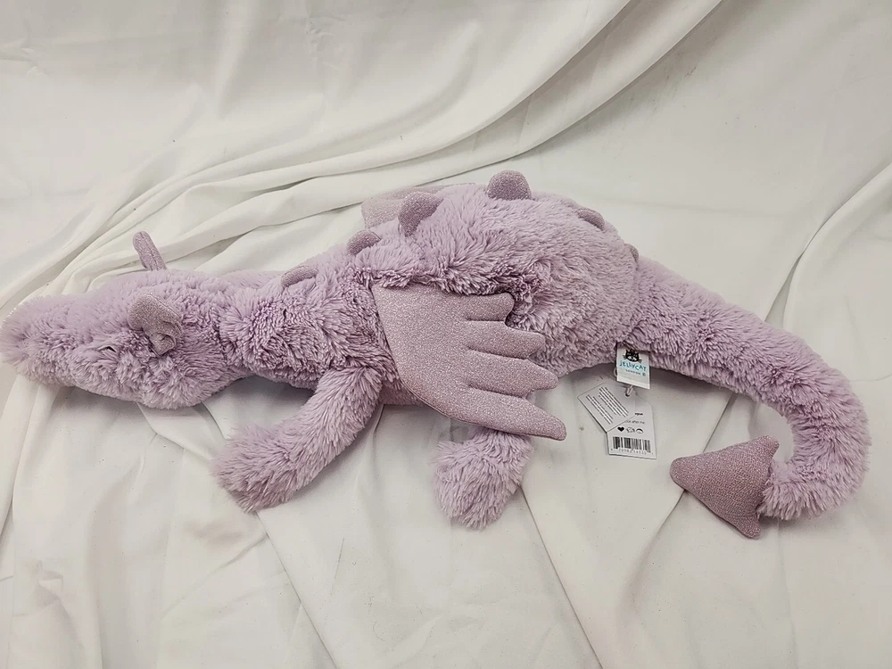 This Jellycat plush toy is an excellent addition to your collection. The vibrant lavender dragon design is sure to catch your eye and bring a smile to your face. With its large size of 26 inches, this plush toy is perfect for cuddling and displaying. Crafted by Jellycat, a renowned brand in the stuffed animal industry, this plush toy is made of high-quality materials and is designed to last for years. Its soft and fluffy texture makes it an ideal companion for children and adults alike. Add this Jellycat plush toy to your collection today and experience the joy of owning a unique and charming stuffed animal.