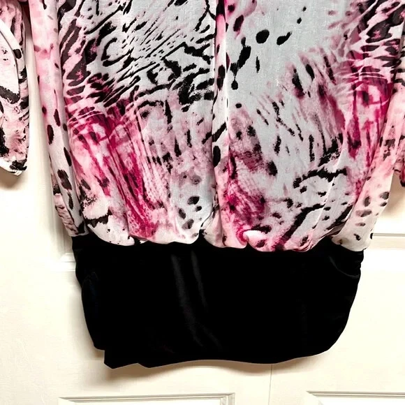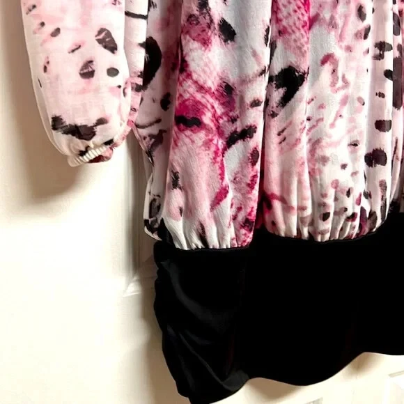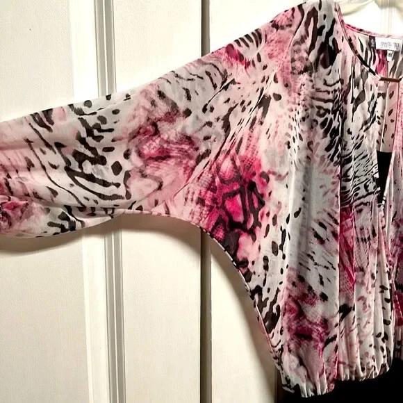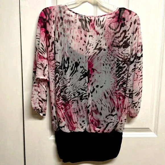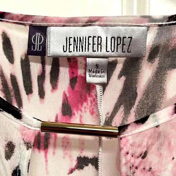 Elevate your wardrobe with this stunning Jennifer Lopez blouse featuring a unique pink and black abstract print. The blouse has a V-neckline and 3/4 dolman sleeves, making it perfect for any occasion, whether it's a casual day out or a fancy party. The lightweight, stretchy material with a shearling fabric type ensures a comfortable fit, while the collarless design and pullover closure add a touch of convenience. This blouse is perfect for the summer, fall, or spring seasons and can be easily paired with any bottom, whether it's jeans, a skirt, or shorts. The blouse is hand wash only and comes in size S. With its hipster, designer, and colorful theme, this blouse is a must-have for any fashion-forward woman. Very good pre owned condition mesh Shell 100% sheer polyester jersey Shell 95% polyester 5% spandex lining 95% polyester 5% spandex 16’ across chest inside top 16.50’ across bottom band side gathers 27’ long from collar seam to bottom front elastic around end of sleeve