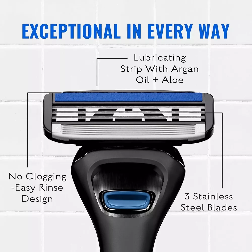 About this item JEREMY'S RAZORS FOR MEN: You’re an American man with high standards & strong convictions. You embrace discomfort fighting for your values, but not while shaving. Get the best shave of your life! COMPLETE SHAVING KIT FOR MEN: Includes 1 razor handle and 1 three-blade razor cartridge. It's your ultimate men's shaving tool for a close shave every time. GET THE BEST SHAVE: Comfortably conquer hair & stubble with our new stainless steel coated blades. Get an incredibly smooth and ultra-close bathroom + shower shave on your face, head and body. PROTECT YOUR SKIN: Jeremy's advanced lubricating strip is infused with argan oil and aloe to continuously moisturize your skin as you shave. Perfect for regular and sensitive skin across the body. LOOK SHARP with advanced razor designs: The pivoting head contours your unyielding, handsome features to prevent nicks and cuts. The ergonomic handle allows for superior control and durability.