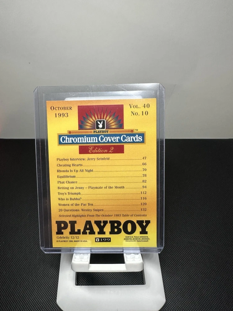 The product is a 1995 Playboy Chromium Cover Card featuring Jerry Seinfeld from the TV show "Seinfeld," specifically from the October 1993 Playboy cover. This non-sport trading card is part of the Chromium Cover Cards Celebrity Redemption Set Ed.1 and is a refractor parallel variety with a card number of 199. It is made of card stock and is in English, targeting an age level of 16+. The card is a limited edition short print, exclusive insert featuring the comedian Jerry Seinfeld, and is a sought-after collectible for fans of the franchise and the TV show.
