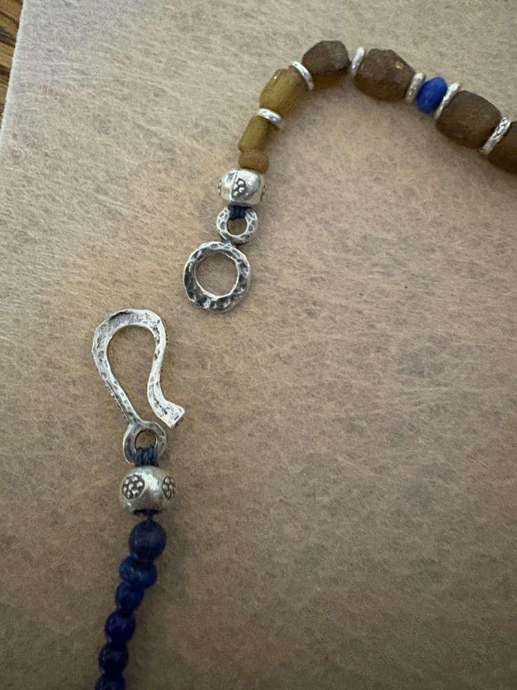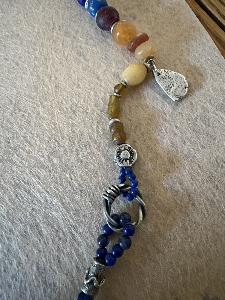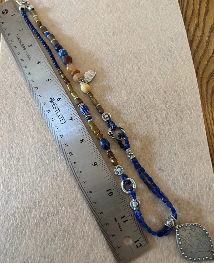 The Jes Maharry Brown and Blue Beaded Necklace is a handmade piece featuring natural blue and brown stones with silver charms and a pendant. The bohemian style necklace is crafted in the United States and showcases excellent craftsmanship. The silver base metal adds a touch of elegance to this unique and eye-catching accessory. Perfect for those who appreciate natural beauty and attention to detail, this necklace is a standout piece for any jewelry collection.