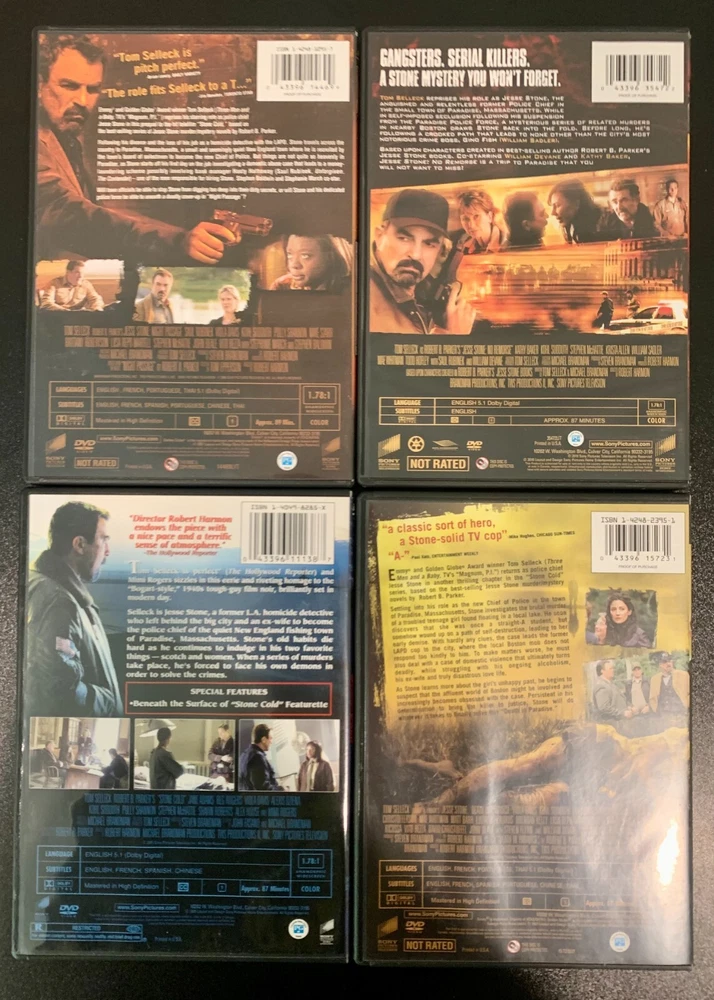 Tom Selleck, Robert B. Parker's Jesse Stone 4 DVD Lot - Death in Paradise, Stone Cold, No Remorse, Night Passage. Ships free via USPS Media Mail.