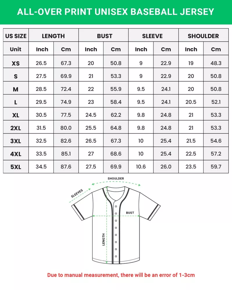 PRODUCT DETAILS ALL ITEMS ARE ALL OVER PRINT (NOT STITCH)! Make your sporty outfit more unique and fashionable with AOP Baseball Jersey now! We got all of what your customers expect with our custom baseball jerseys. The boxed flatback mesh fabric of the custom baseball jerseys offers outstanding durability, insulation, and wrinkle resistance. Our baseball jerseys can do machine wash in cold with similar colors/no bleach/low iron. Baseball jerseys are breathable, durable, and easy to care for, polyester is the ideal material for athletes everywhere. Feel free to create a design with our custom baseball jerseys. You can put the player names or logos on our great quality baseball jerseys. Moisture-wicking. Our baseball jerseys are prepared with full Button Down Closures. You can wear our baseball jerseys on many different occasions such as hanging out with friends, going to sporting events, or even wearing them as custom baseball uniforms if you are in uniform needs with your team, etc. We do provide special offers for big orders FYI. You can mix baseball jerseys with their daily apparel such as jeans, leggings, shorts, etc. Average Est. Shipping Time: 10-20 business days. 2-6 additional days due to external factors beyond our control. NOTE: 1. Please allow 0.5" - 2cm differs due to manual measurement. 2. The color may be a little different due to the effect of light and monitor setting, please understand. 3. All are unbranded product and use printing technology (not stitch).
