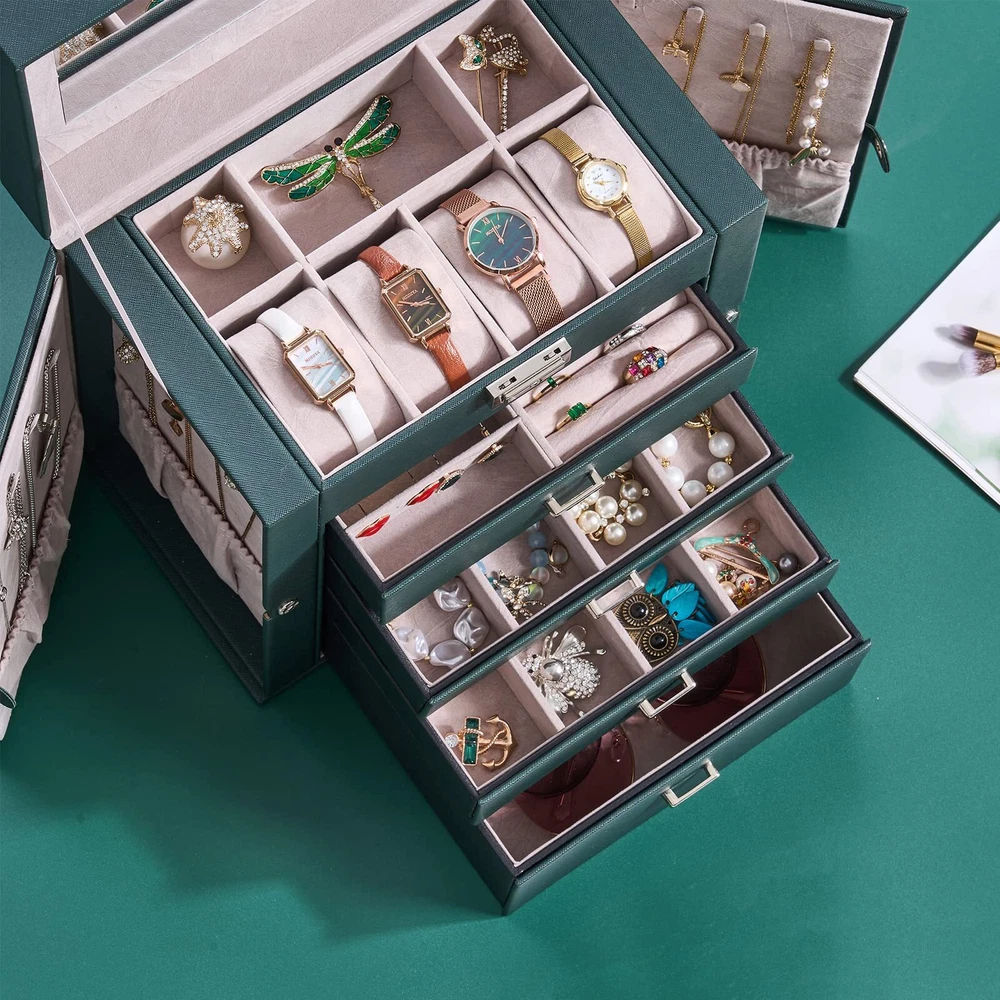 LARGE CAPACITY JEWELRY BOX:5-tier and 2-wings can organize all your jewelry. The top layer with lock and mirror to valuable jewellery. Contains 4 pillows, 4 earring grids and 7 ring cushions, 12 equal-sized squares, large sunglasses grid. The middle 3 layers can be interchanged MULTI-FUNCTIONAL JEWELRY ORGANIZER:The jewelry box It can be put a couple watches, earrings, rings, necklaces, hairpins,brooches, bracelets, and some sunglasses distributed into all the drawers. Avoid jewelry tangle and loss and tarnish in the air, keep your desktop neat and clean STURDY and ELEGANT for WOMEN:The jewelry box frame is made of medium density fiberboard, the structure is stable and will not dent or fall apart. The exterior is Faux Leather, which can be cleaned with a damp cloth without cracks or peeling. The interior soft velvet lining can protect your jewelry from scratches.Elegant and suitable for women of all ages JEWELRY ORGANIZER BOX with LOCK and MIRROR: Intimate and convenient. You can save your precious jewelry box in the lockable grid to prevent loss and trouble. The mirror on the top layer is convenient for you to choose the right jewelry to match your makeup, and find the objects you want more quickly GIFTABLE-BEAUTIFULLY CRAFTED:The jewelry box exquisite workmanship and exquisite hardware. For GF, MOM and daughter, it is a good choice for Valentine's Day, Mother's Day, birthday or Christmas SMALL FOOTPRINT: 10.67" L x 11.30" H x 6.22 W, It can be placed on your dressing table or vanity, it will not take up a ton of space