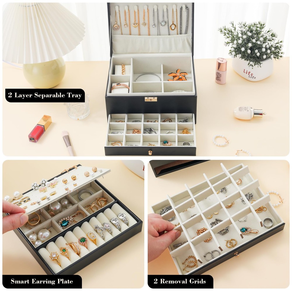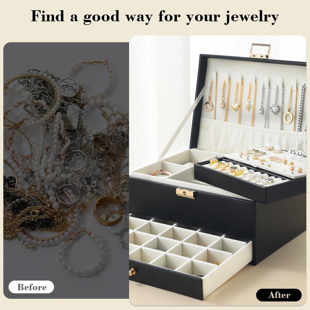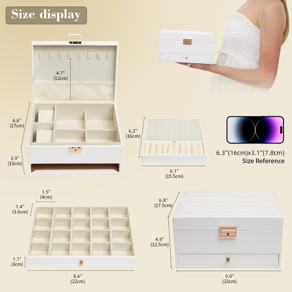 Material: Jewelry storage box made with High quality Faux Leather, velvet lining provides good care for your gems,durable and dirt-resistant,waterproof, non-deformable,metal buckle easy to opening and closing,keep your jewelry ready to wear and clean Capacity: The large jewelry organizer has 3 layers, 9 rings slots, 54 ear stud holes, 2 watches slots, 4 bracelet slots, 20 slots with 1 drawer for other accessories,made a new upgrade on the basic of the original Jewelry Box Organizer Size: 23x17.5x12.5cm(9"x6.89"x4.92" IN),weight: 1.76 lbs,storage organizer is enlarged,convenience for you to collect different types of jewelry,do not need to waist any extra time to find lost jewelry Meaningful Gifts: Exquisite design and elegant craftsmanship jewelry box is a perfect gifts for women, speical occasion like Valentine's Day, Mother's Day, Thanksgiving Day, Christmas and Wedding, Birthday, Anniversary, unique and sweetful Display Your Charms:Jewelry boxes for women will be separated and untangled your jewelry, top lid with 8 hook for your necklace and pandent,elastic shirred catch pouch keeps pandent neat and stay in place,top drawer for watches, bracelet, earring and rings collect, easy to find and catched your need moment time,Third layer boasts a specially designated area for your precious jewelry pieces, ensuring easy access and perfect storage