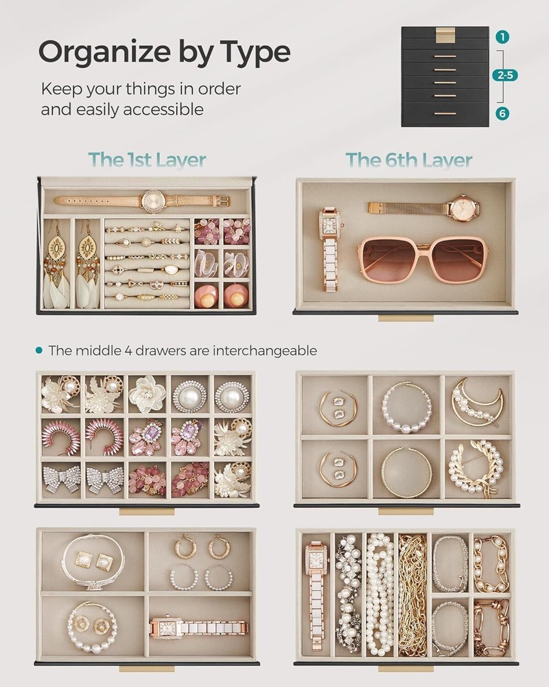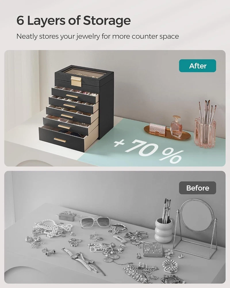 Material MDF (Medium Density Fiberboard), PU (Polyurethane), Velvet, Glass Style Modern Special Feature Durable,Jewelry Organizer,See-through Recommended Uses For Product Necklace, Bracelet, Ring, Watch, Earring, Bangle Product Dimensions 6.4"D x 9.9"W x 11.4"H Target Audience Women, Girls Shape Rectangular Occasion Anniversary, New Home, Birthday See less About this item [Storage, 6 Layers] Keep all your jewelry organized in this jewelry box—small pieces of jewelry go in the various slots of the top 5 layers, and sunglasses and watches go in the big bottom drawer [Clear Glass Lid] The see-through glass lid of this jewelry organizer allows you to see and find your favorite jewels at a glance while protecting them from dust, keeping your jewelry ready to wear and clean [Chic & Durable] Elegant black and gold colors, shiny metal handles, soft velvet lining, neat stitching, quality PU, and sturdy MDF—all these elements combined make this jewelry case stylish and durable enough for your ever-growing jewelry collection [Perfect Gift Idea] Gift this original design jewelry box to your loved ones for their birthday or anniversary to surprise them! Or, treat yourself to this fancy jewelry box—you deserve it! [Versatile Use] This modern jewelry holder looks nice whether displayed on the dresser of your bedroom or your cloakroom to organize your pins, necklaces, rings, bracelets, and other accessories Material MDF (Medium Density Fiberboard), PU (Polyurethane), Velvet, Glass Style Modern Special Feature Durable,Jewelry Organizer,See-through Recommended Uses For Product Necklace, Bracelet, Ring, Watch, Earring, Bangle Product Dimensions 6.4"D x 9.9"W x 11.4"H Target Audience Women, Girls Shape Rectangular Occasion Anniversary, New Home, Birthday Mounting Type Table Top Finish Type Glossy Inner Material Velvet Closure Type Drawer Number of Drawers 5 Item Weight 5.3 Pounds Number of Compartments 6