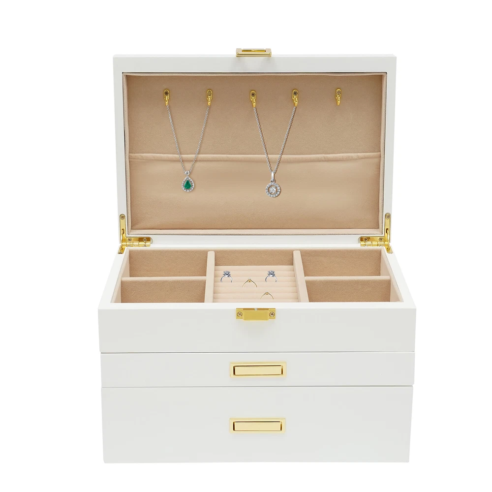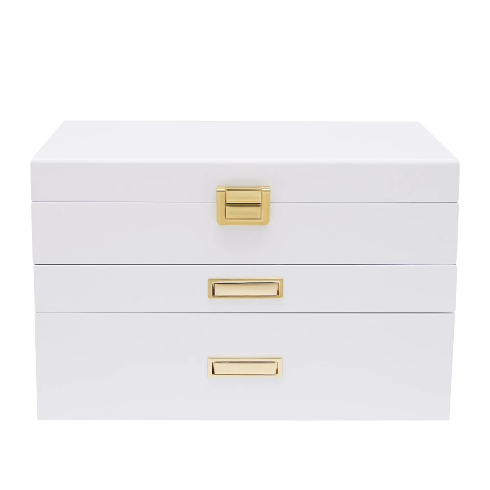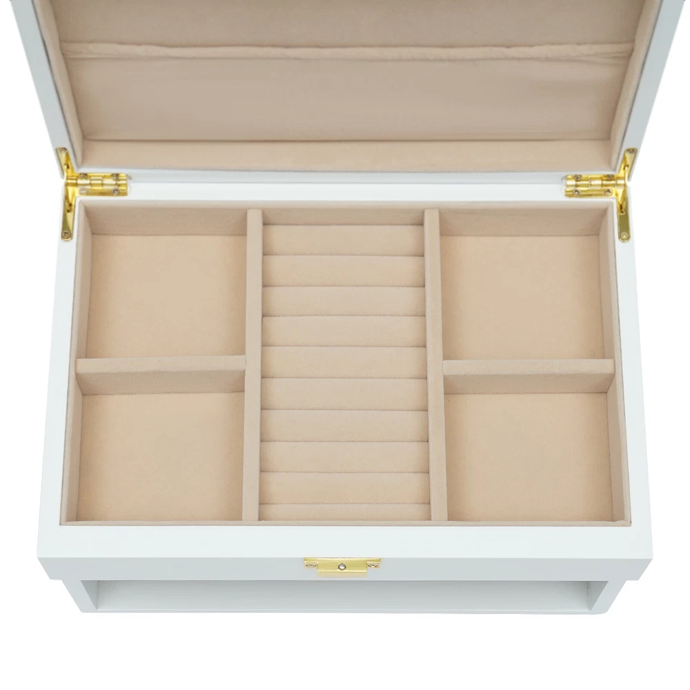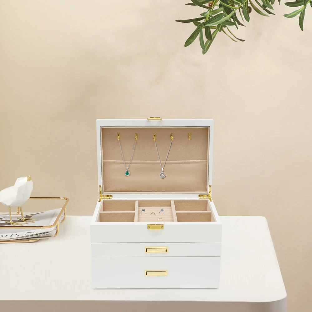 Jewelry Case Jewelry Box Box Gifts Box with 2 Drawers White for Storage Earrings Description Is your fine jewelry still piled up on the vanity cabinet with dust? Are you still worried that you can't find the jewelry you want when you go out in a hurry? This beautiful and practical jewelry box can solve all your troubles. The three-layer storage design allows you to store many different kinds and sizes of jewelry, and helps your jewelry and tabletop keep clean and beautiful! It will be a unique organizer for all your beautiful jewelry! Key Features Rational Layout: Depending on the size of your everyday jewelry and its characteristics, this jewelry box is designed with compartments of different sizes, as well as special necklace hangers, ring rolls, and watch compartments with removable pillows for more secure storage, display, and selection of your jewelry. Full Pull-out Drawer: The full pull-out drawer design is convenient for displaying and accessing all jewelry, and you can also rearrange each drawer according to your usage habits. Elegant Appearance : The classic white jewelry box with lustrous metal handles showcases its nobility, elegance, and style. It complements your noble temperament while adding elegance to your dressing table. Sturdy and Durable : Our jewelry box is made of high-quality density board with a painted exterior that is waterproof, wear-resistant, impact-resistant, and long-lasting, as well as very sturdy to provide good support and stability. Large Capacity : This large size (11*7.5*7.1in) jewelry box is designed with three layers to give you plenty of storage space. With this large-capacity jewelry organizer, your various jewelry will have a warm and spacious home. Great Organizer: This jewelry box will keep all your jewelry well organized, neatly displayed, and safely stored. The unique drawer design and lid provide excellent water and dust resistance for jewelry. Ideal Gift: This jewelry box has a unique design with a beautiful appearance and a large capacity with practical features. It is an ideal gift for Valentine's Day, Mother's Day, Thanksgiving, Christmas, birthdays, and weddings. Ready to Use : This 3-layer jewelry box can be used directly without extra installation, saving your time and energy. Easy to Clean : It has a painted finish to make it easy to clean. You can easily remove dust and stains from it with just a damp rag. Customer Service: We aim to provide quality products and services. If you have any problems, please feel free to contact us. We will reply and solve the problem for you as soon as possible. Details Plush Lining: The jewelry box is designed with a plush lining that not only gives you a comfortable touch but also protects your jewelry from scratches and crushing so that your precious jewelry will be well cared for until the next time you use it. Anti-slip Pads: It has non-slip pads on the bottom for more stable placement. It also prevents the table from being scratched. Necklace Hook: The cover is specially designed with 5 hooks for the necklace, which can better display the necklace and prevent it from knotting. A pocket is also designed below the hook to fix the necklace or store other items. Premium Hardware: The gold hardware of this jewelry box is electroplated for color fixation, which makes it glossy and textured, and also prevents corrosion and rusting. Attractive Design Handle : The hidden handle design is both beautiful and practical. When you need to use it, you just need to press the right end of the pull with your thumb, and then the left end will be raised for successful pulling out of the drawer, which is an innovative and stylish design. Application It is suitable for organizing various jewelry including sunglasses, watches, hairpins, earrings, rings, bracelets, watches and necklaces. Specifications Material: Density Board, Hardware Hardware Process: Electroplated Process: Painted Lining Material: Plush Color: White Style: Modern Number of Layers: 3 Shape: Rectangular Mounting Type: Free-standing Watch Compartment Size: 5*8.5cm/2*3.3in Second Layer Smaller Compartment Size: 4.3*4.8cm/1.7*1.9in Second Layer Larger Compartment Size: 3.5*15.5cm/1.4*6.1in Packing Size: 34*25*25cm/13.38*9.84*9.84in Product Size: 28*19*18cm/11*7.5*7.1in Gross Weight: 3.2kg/7.05lbs Net Weight: 2.8kg/6.17lbs Package Included 1* Jewelry Box Notes Please allow the slight color difference caused by the shooting light and 1-3cm error due to manual measurement, and make sure you do not mind before you order. Payment Delivery details Terms of sales About us Contact us Payment We accept ebay payment 。 Fees such as import duties, taxes are not included in the item price or shipping costs. These charges are the buyer's responsibility. Delivery details Shipping: 2-9 working days to: USA Terms of sales We maintain high standards of excellence and strive for hundred percent customer satisfaction. Feedback is very important to us. We hope that you contact us immediately before you give neutral or negative feedback, so that we can address your concerns. It is impossible to address issues if we do not know about them! About us Your satis faction is our ultimate goal. We work hard to earn your trust and future business. Our certified technicians have tested each item before shipping. The unit comes with 1 year limited warranty on all manufacturing defects. a) If you receive a defective item, you may return it or ask for a discount. Please contact us within 14 days after you receive the package. b) What you returned must be intact and in its original packaging as re? u. Customer is responsible for shipping costs of the returned item. c) We will cover the cost of shipping back t with the shipping rate indicated in the registration page. We will send you a new unit or refund the full payment you paid. Thank you. Contact us Business Hour Business Hour: Monday To Friday: 8:30 AM to 5:00 PM (Beijing China time) Due to time zones, our reply to your questions may