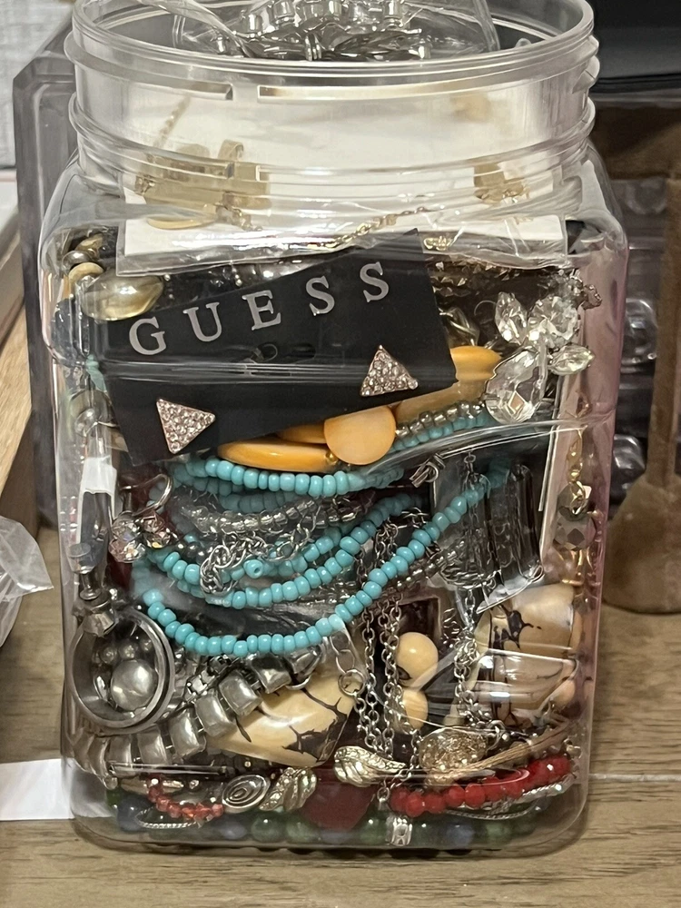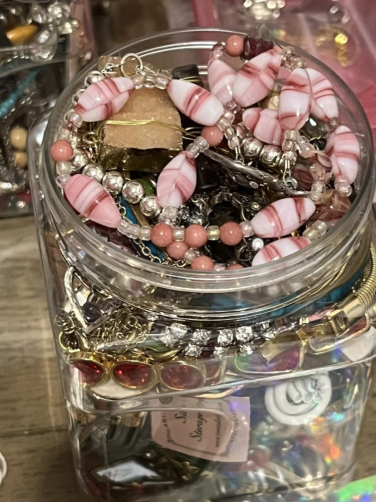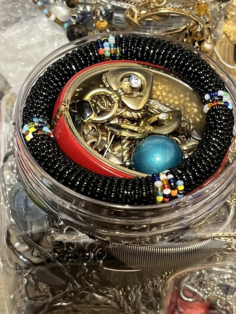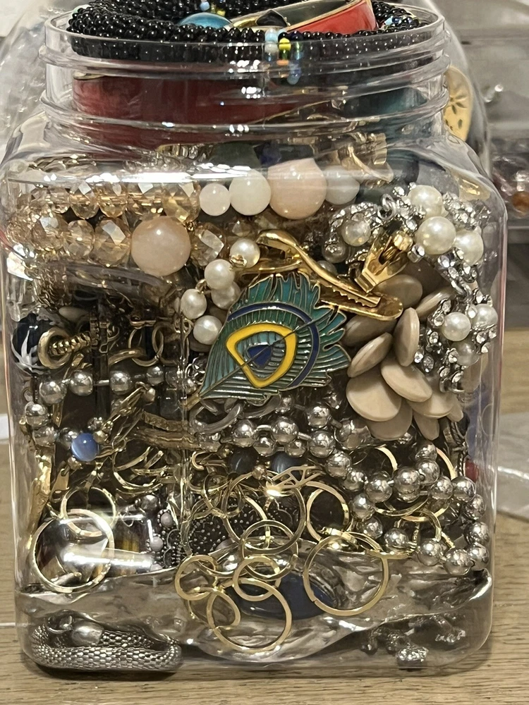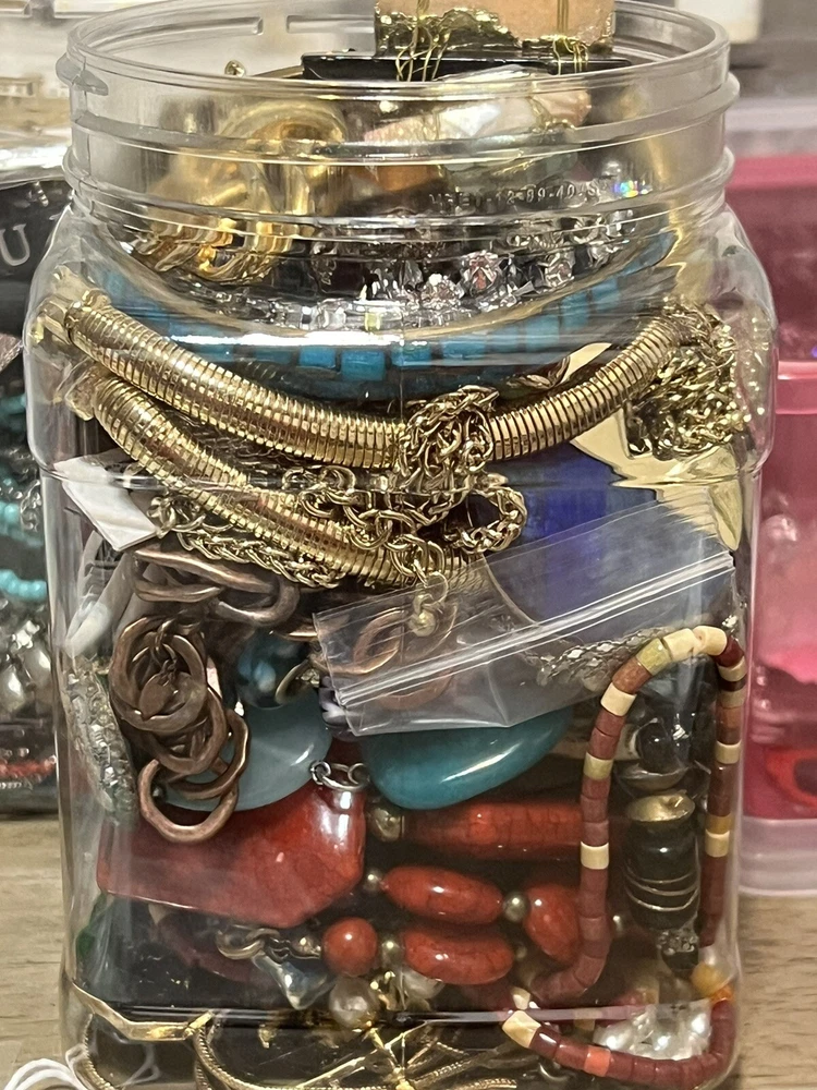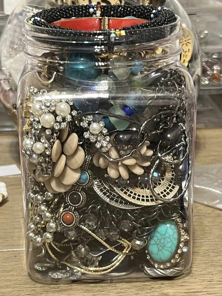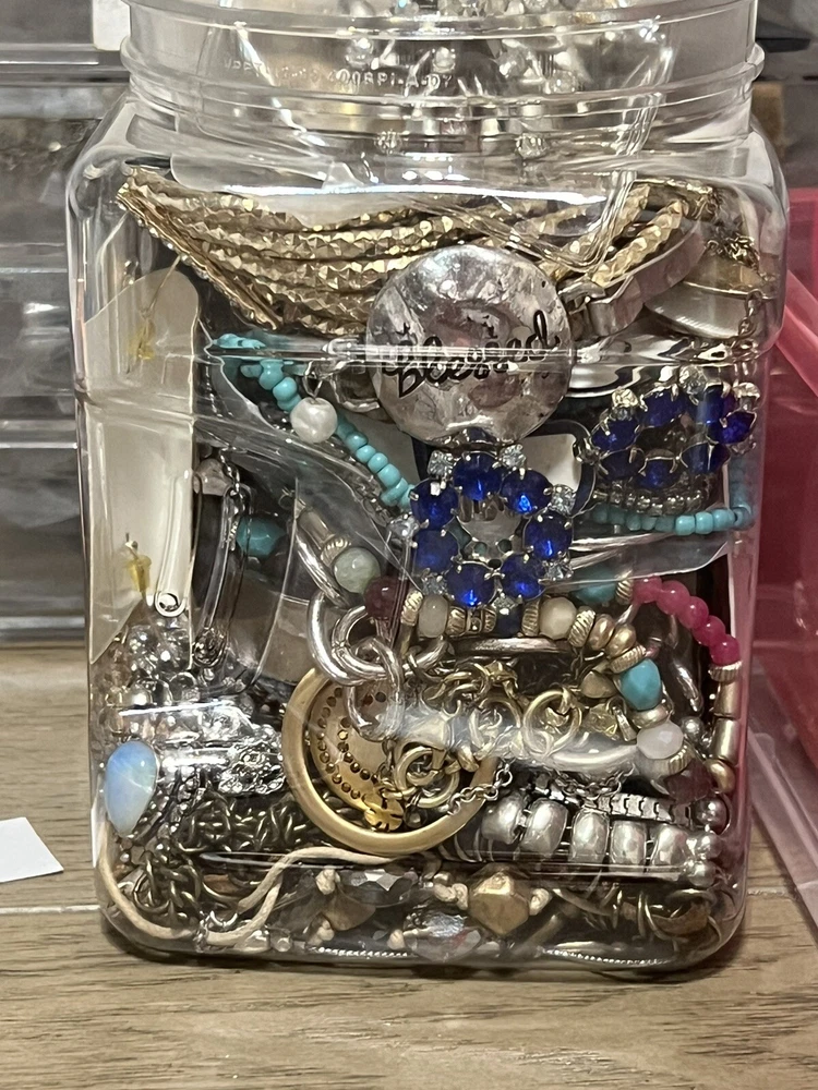 FYI- photos are sample photos. Typically it’s a jar that was created and. Already sold. So, any photos you have seen are jars that have been made for that customer one at a time and a lil personalized for you . I will message you after you purchase any of my jars. They are selling fast. Most pieces are basically the only one I have that identical especially vintage. I have a lot of vintage. More present day pieces that you may see in a photo I could have something similar. All hard I work very hard to create . Rem the sooner your order is in the quicker I can make it and send it out to you. First come first serve I sell off two apps for these jars and jewelry has been clearing out but I have more vintage that I’m looking thru now. I truly appreciate everyone that has purchased from me especially since I’m new to selling on eBay., offers are welcome plz consider the fees for using their services bc you will receive jewelry in much more then the value im making. I kinda over do it some. Rem it’s a treasure hunt with no TRASH ALL WEARABLE. You will receive exactly what I stated vintage to now all wearable good condition. Some items may show wear that maybe vintage and if I think that it takes away from the piece I won’t add it but rem diamonds in the rough phrase. Below it overly explains. I’m editting and making another listing dif photos! Ty! This is a plastic short wide canister that holds a decent amount of jewelry. I like the wider mouths bc I can top off with bracelets sometimes all the way to run they fit perfectly depending bracelets in stock. Anyway now you do have a choice of the clear new from factory or amazon reusable jar. Now introducing th clear blue plastic mason jar w metal lid. You can let me know in message with a couple ring sizes if you want any rings at all. It’s very busy so please be patient I’m doing them in order as received and adding a lil personalization touch . I will message you when I’m closer to your name tho. So not to worry. I would advise for Xmas gifts since I’ve been doing a lot of gift jars to likely get your order in a month ahead of time. I’m trying to adjust inventory in order for increased sales since it’s been steadyily busy I just want to be ready for whatever request you have rem I do have jars in dif size gift boxes and it’s just a dif way and individually bagged by number of pieces and I give you the rt size box that is decorated kinda a cardboard type gift box that flips open I have many dif colors that are bright and girly or more subtle. It a great presentation too in comparison to the jar. Still same experience sane customer service. I will adjust listing for fully curated of the grab bag box is what I named it. Prob need to rename. Back to the jar sorry! I’m having to do an edit to give you the choice of clear blue plastic mason jar. If not will be the short squared wider jar. Hold about the same amount of jewelry. I may provide an extra gift bag if I see that a bulkier piece is taking up to much room. I do consider that so not to worry. Signed and unsigned vintage and more jewelry coming nwt jewelry too I’m getting today or tomorrow. I’m excited for both of us!thank you!——- jar packed full all the way too typically the rim where sometimes I have to press down On the lid before it twist! No worries, I know better than to damage any jewelry. The canister w/ lid I’m finding it’s been A nice way to travel and keepPieces or you can reuse. Its new from Amazon. I’m buying them in bulk way more expensive than the price I paid and I def don’t charge you for it. To me it’s for presentation and people love jewelry jars just as much as a mystery box made to be like a jewelry jar. I offer that too. Still all In presentation is super cute for gifts and the box you can message me on how many pieces bc you may need a few for gifts and then you can customize. They are very nice boxes I haven’t explained in detail on my listings but I have some for a five piece up to a 40 piece more then likely. They look wrapped and ofcourse I package them up to mail I don’t mail them like that. This canister is packed. I was trying to stay around a lil over a pound but for some reason I have made them over two and three pounds. These are mixed with vintage to now. Signed and unsigned pieces. I try to give everyone a variety . Each time a jar order comes thru I prepare in order they come. So, my sole focus is on your jar when I make yours granted depending how many are ahead it can take up To three days to purchase. If you have small preferences or request I can try to honor As long as it’s fair to everyone. I’m All about kindness and fairness And honesty and that goes quite far in my book bc we need more of that. It will be mixed materials plz don’t Buy this jar for good then be highly disappointed there isn’t any. All times you maybe get plated or filled or you could get lucky but this is a lot of costume, vintage, current, fashion, designer. Signed unsigned pieces. Boutique pieces just an array of jewelry. Sometimes I do run on particular kinds of vintage and I do have my own personal stash I will use to sell on ruby lane but honestly im down sizing tho I keep buying some amazing jewelry. Its all quite beautiful Even the ones w flaws I take out for crafts tho I have a massive load of harvest craft so by all means message me n get a great price n I can crate the listing. It started w my great grandmothers and then it almost became like a dream I loved it. I love the learning, the history is by far very interesting. Anyway I hope that I can finally down size enough to where I know where each type is at bc I do let go of some special Pieces bc im Not researching what I’m Putting in your jars ik having To just let go. It’s very hard for me bc a lot of it I want to sell but I can’t. There isn’t enough time in The next few years. I’m Not saying everything is collectible but to have a load of vintage and pre