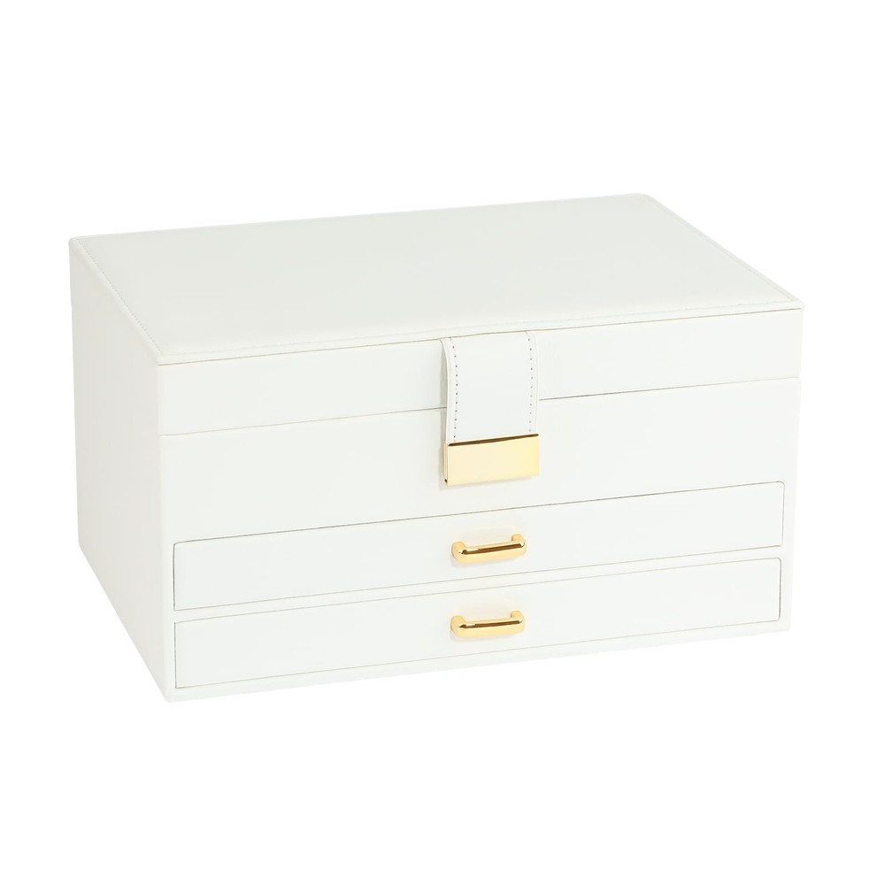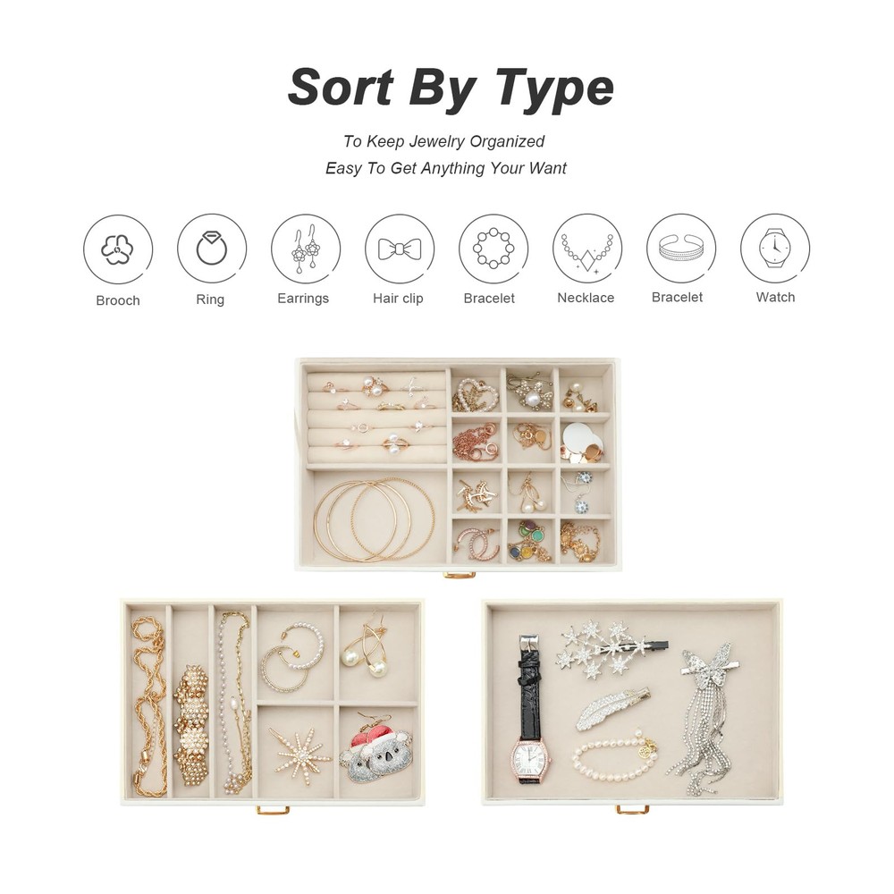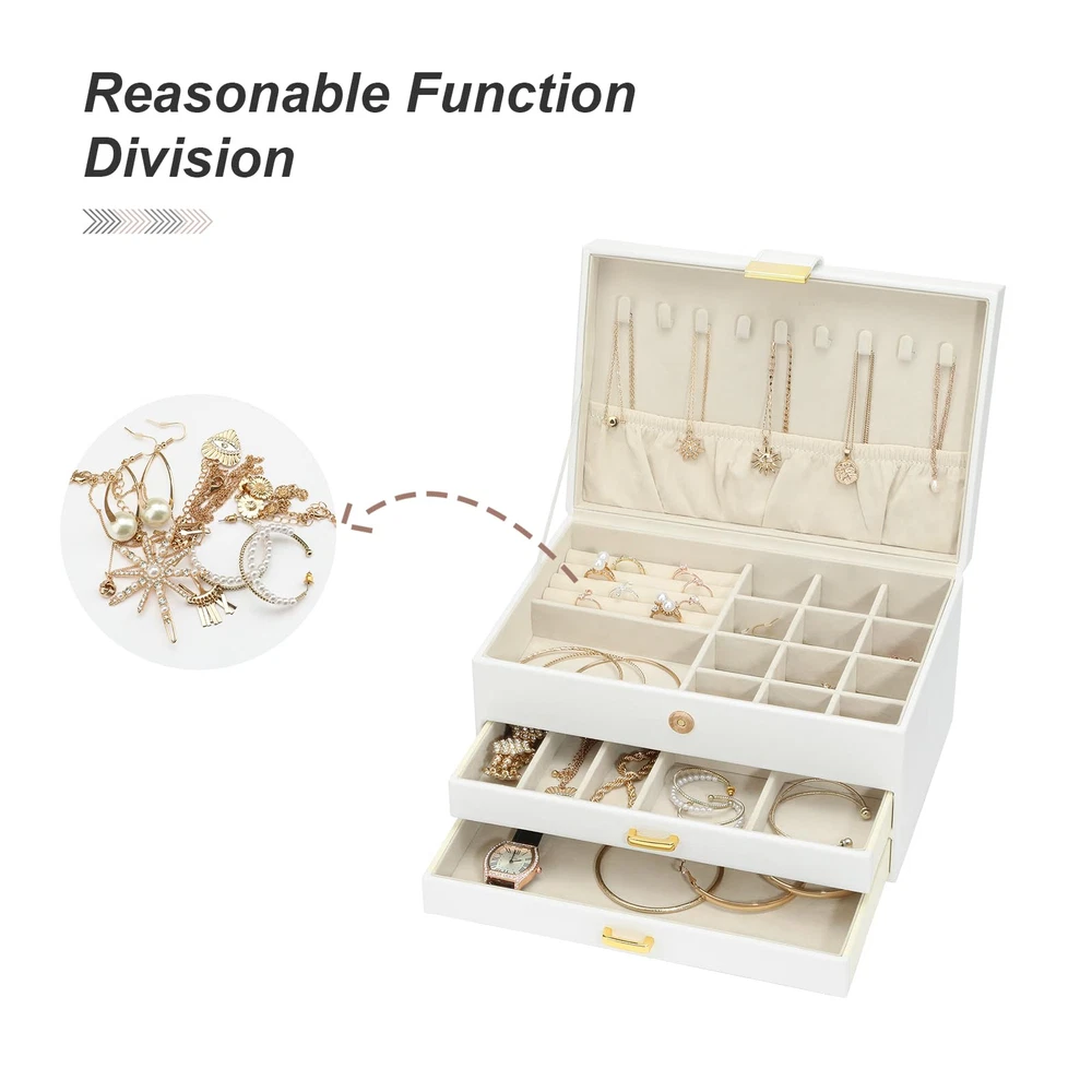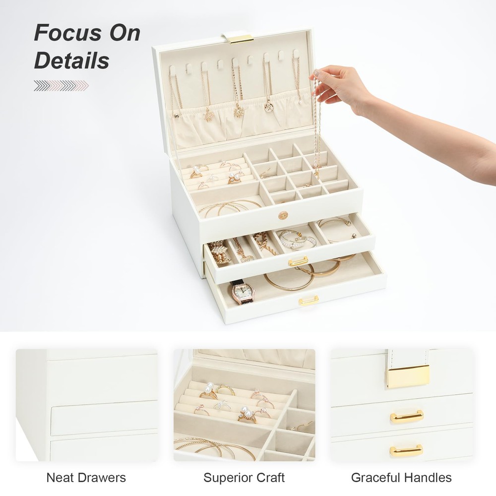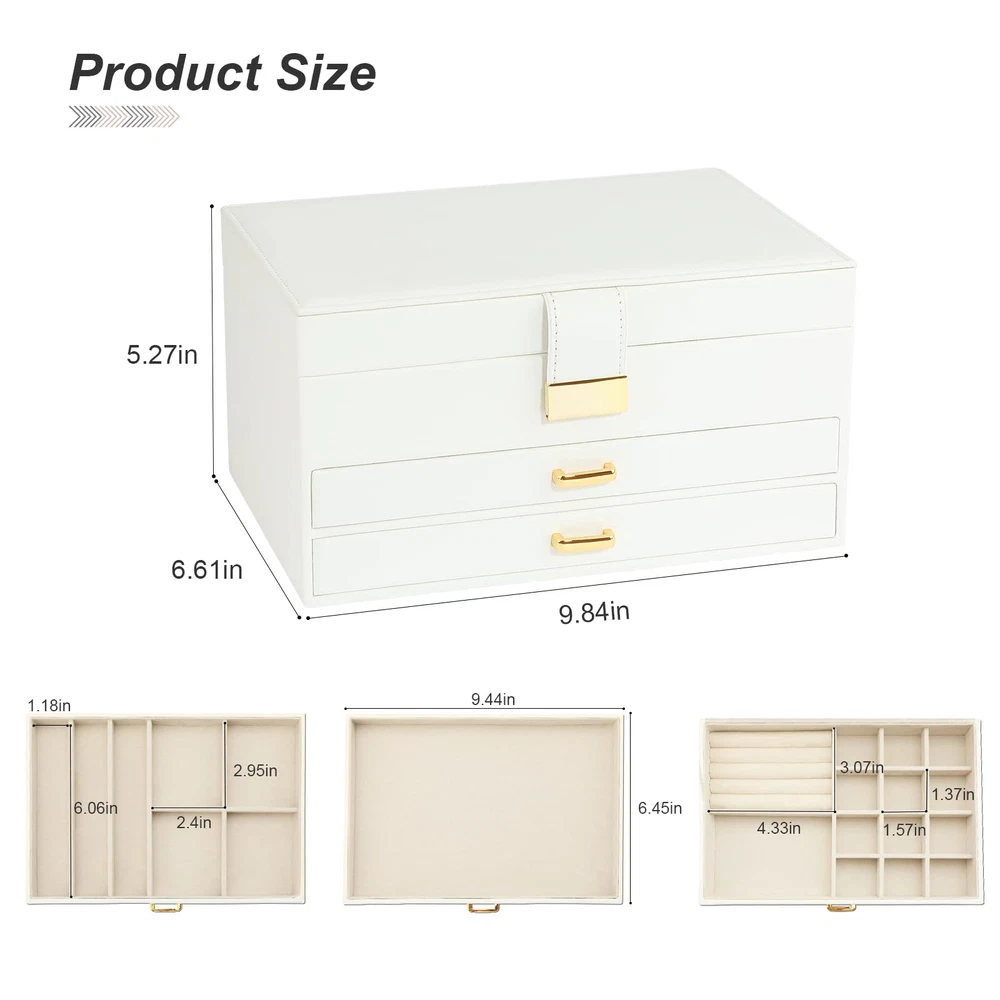 This modern jewelry holder looks nice whether displayed on the dresser of your bedroom or your cloakroom to organize your pins, necklaces, rings, bracelets, and other accessories. 9 necklace hooks, 3 levels-2 drawer design is enough to keep your jewelry neatly organized. Almost all your different size jewelry and accessories. 1st level has various areas that can hold earrings, rings, and bracelets. 2nd level has 2 kinds of grids for watches and pins. 3rd level is empty and can store other accessories. Jewelry box is made of premium engineered wood and is not easy to deform. With durable PU leather and soft imitation fur lining. Perfect for protecting your beloved jewelry from scratches and damage. Large-capacity size (L x W x H): 9.84" x 6.61 "x 5.27". Perfect for a Christmas Gift. Whether for a friend or your lover, this jewelry organizer will support any holiday or birthday with an unforgettable memory. Fill it with new jewelry as a lovely surprise and make it a one-of-a-kind gift.