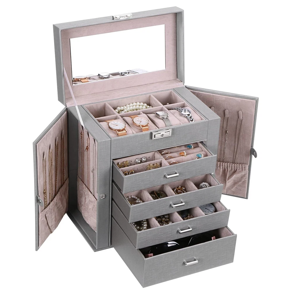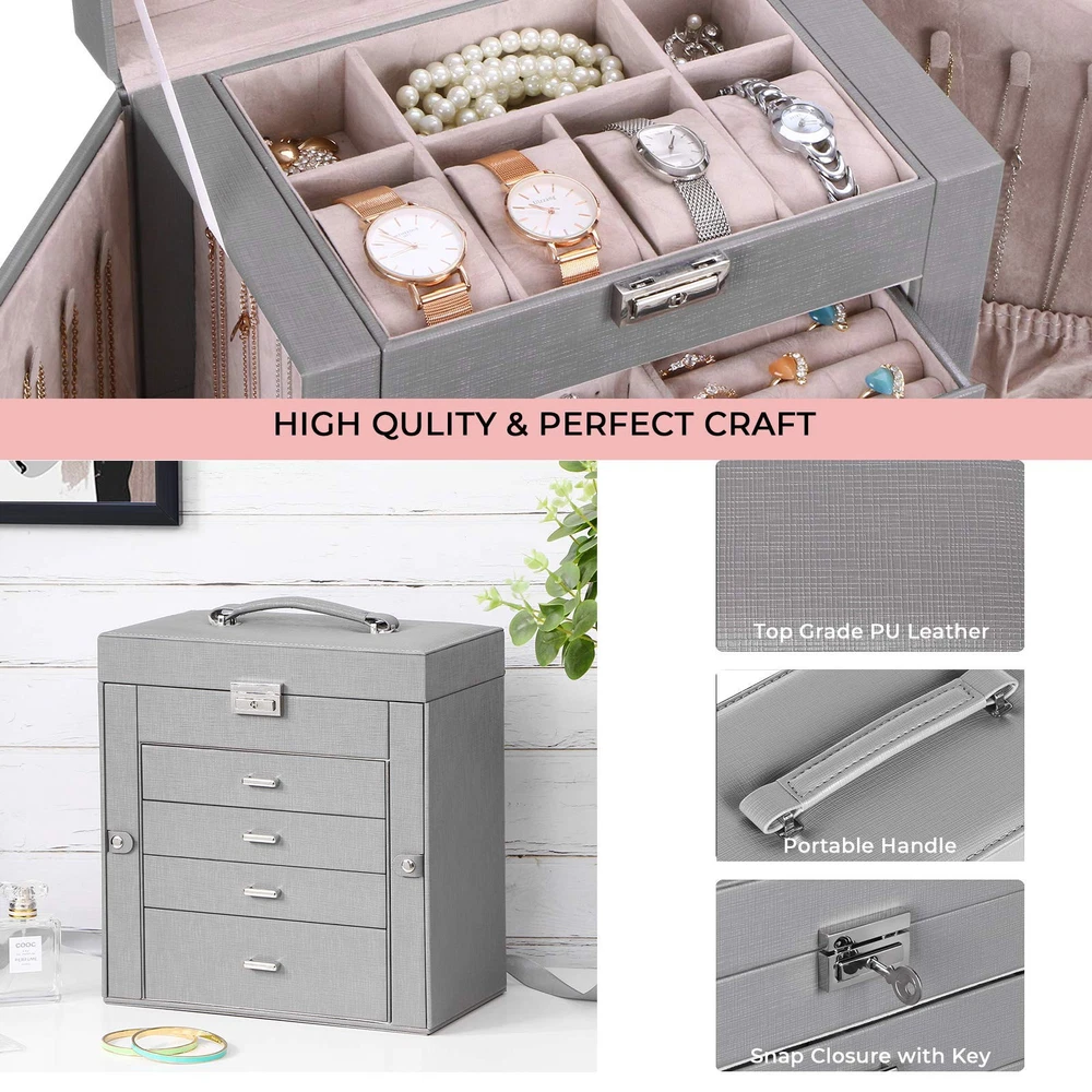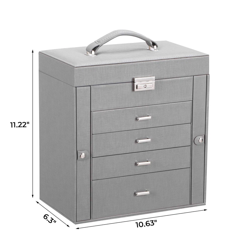 LARGE CAPACITY JEWELRY BOX:5-tier and 2-wings can organize all your jewelry. The top layer with lock and mirror to store valuable jewellery. Contains 4 pillows, 4 earring grids and 7 ring cushions, 12 equal-sized squares, one large sunglasses grid. The middle 3 layers can be interchanged SMALL FOOTPRINT: 10.67" L x 11.30" H x 6.22 W, It can be placed on your dressing table or vanity, it will not take up a ton of space MULTI-FUNCTIONAL JEWELRY ORGANIZER:The jewelry box It can be put a couple watches, earrings, rings, necklaces, hairpins,brooches, bracelets, and some sunglasses distributed into all the drawers. Avoid jewelry tangle and loss and tarnish in the air, keep your desktop neat and clean STURDY and ELEGANT for WOMEN:The jewelry box frame is made of medium density fiberboard, the structure is stable and will not dent or fall apart. The exterior is Faux Leather, which can be cleaned with a damp cloth without cracks or peeling. The interior soft velvet lining can protect your jewelry from scratches.Elegant and suitable for women of all ages JEWELRY ORGANIZER BOX with LOCK and MIRROR: Intimate and convenient. You can save your precious jewelry box in the lockable grid to prevent loss and child trouble. The mirror on the top layer is convenient for you to choose the right jewelry to match your makeup, and find the objects you want more quickly GIFTABLE-BEAUTIFULLY CRAFTED:The jewelry box exquisite workmanship and exquisite hardware. For GF, MOM and daughter, it is a good choice for Valentine's Day, Mother's Day, birthday or Christmas