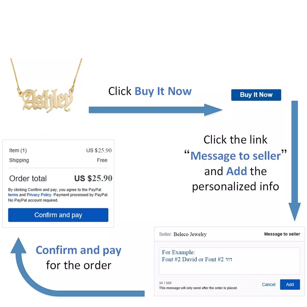 HIGH QUALITY FREE SHIPPING FOR US ORDERS BEST PRICING Beleco Jewelry making beautiful jewellery for woman and man, like this "Hebrew Name Necklace" , a beauty jewelry with a semantic value from Israel the Jewish State. Be perfect special gift for her or you, gift for mom, sister or gift for your best friend. This is unique gift for Bar and Bat Mitzvah! H O W ∙ T O ∙ O R D E R: ✔ Choose necklace length and type. ✔ Choose material and font style. ✔ Leave the name in the "message to Seller" box when you checkout with your personalization name. ▪ Up to 12 characters. Item Description: ▪ Material: Sterling Silver 925 or Gold/Rose Gold Plated 18k. ▪ It's coat with at least 2 micron of real 18K gold for a long lasting item. ▪ Pendant size: 16*16mm. Necklace Length: ▪ 16 inches = 40 cm (Age 6-18 years). ▪ 18 inches = 45 cm (Most popular size for women). ▪ 20 inches = 50 cm (Please See Size Picture). ▪ 24 inches = 60 cm (Please see Size Picture). Shipping Payments Returns ABOUT US Shipping Payments Returns ABOUT US ▪ US ORDERS: Standard shipping 1-5 business days (FREE). DHL Express 1-4 business days (14.90$). ▪ Other countries: Expedited shipping by DHL Express 2-6 business days (14.90$). Please pay attention: ▪ We ship to your eBay or Paypal address. Please make sure your eBay and Paypal address is correct before you pay. ▪ Items will be shipped within 1-5 business days when we received payment. ▪ International buyers please note: A. Import duties, taxes and charges are not included in the item price or shipping charges. These charges are the buyer’s responsibility. We will try our best to reduce the risk of customs duties. B. Please check with your country's customs office to determine what these additional costs will be prior to buying. We accept payment by any of the following methods: PayPal If you are not 100% satisfied with your purchase, you can return the product and get a full refund or exchange the product for another one, be it similar or not. You can return a product for up to 30 days from the date you purchased it. Any product you return must be in the same condition you received it and in the original packaging. Shipping charges for item return will apply to the customer. Hey there, welcome to Beleco Jewelry! At BELECO, we take a personal approach to not only design, but customer service. You could say we are all about personality, personalization and personability. All of our handmade jewelry is made from top-notch materials and is full of fun, flare and a playful attitude towards life and style. We love to experiment with different typography styles, create unique takes on classic pieces and show off our expertise in silver, gold plating and engraving. We believe that every person deserves a unique piece of jewelry, just for them or for their loved ones. This is why we love to offering personalized pieces that allow anyone to become part of the design process - making the final jewelry piece that much more meaningful. Through our eclectic collection and then free-wheeling customization, anyone can get what they truly want (and look great doing it!) To put a cherry on top, our customer service standards are top-tier. We not only offer a 1 year warranty, but also a 100 day return policy. Our delivery is speedy, our team is friendly, and we genuinely just want to get you the best (sparkliest and specialist) piece of jewelry you could want. ✨Keep Shining ✨ -The BELECO Team Beleco Jewelry making beautiful jewellery for woman and man, like this "Hebrew Name Necklace" , a beauty jewelry with a semantic value from Israel the Jewish State. Be perfect special gift for her or you, gift for mom, sister or gift for your best friend. This is unique gift for Bar and Bat Mitzvah! H O W ∙ T O ∙ O R D E R: ✔ Choose necklace length and type. ✔ Choose material and font style. ✔ Leave the name in the "message to Seller" box when you checkout with your personalization name. ▪ Up to 12 characters. Item Description: ▪ Material: Sterling Silver 925 or Gold/Rose Gold Plated 18k. ▪ It's coat with at least 2 micron of real 18K gold for a long lasting item. ▪ Pendant size: 16*16mm. Necklace Length: ▪ 16 inches = 40 cm (Age 6-18 years). ▪ 18 inches = 45 cm (Most popular size for women). ▪ 20 inches = 50 cm (Please See Size Picture). ▪ 24 inches = 60 cm (Please see Size Picture). HIGH QUALITY FREE SHIPPING FOR US ORDERS BEST PRICING Beleco Jewelry making beautiful jewellery for woman and man, like this "Hebrew Name Necklace" , a beauty jewelry with a semantic value from Israel the Jewish State. Be perfect special gift for her or you, gift for mom, sister or gift for your best friend. This is unique gift for Bar and Bat Mitzvah! H O W ∙ T O ∙ O R D E R: ✔ Choose necklace length and type. ✔ Choose material and font style. ✔ Leave the name in the "message to Seller" box when you checkout with your personalization name. ▪ Up to 12 characters. Item Description: ▪ Material: Sterling Silver 925 or Gold/Rose Gold Plated 18k. ▪ It's coat with at least 2 micron of real 18K gold for a long lasting item. ▪ Pendant size: 16*16mm. Necklace Length: ▪ 16 inches = 40 cm (Age 6-18 years). ▪ 18 inches = 45 cm (Most popular size for women). ▪ 20 inches = 50 cm (Please See Size Picture). ▪ 24 inches = 60 cm (Please see Size Picture). Shipping ▪ US ORDERS: Standard shipping 1-5 business days (FREE). DHL Express 1-4 business days (14.90$). ▪ Other countries: Expedited shipping by DHL Express 2-6 business days (14.90$). Please pay attention: ▪ We ship to your eBay or Paypal address. Please make sure your eBay and Paypal address is correct before you pay. ▪ Items will be shipped within 1-5 business days when we received payment. ▪ International buyers please note: A. Import duties, taxes and charges are not included in the item price or shipping charges. These charges are the buyer’s responsibility. We will try our best to reduce