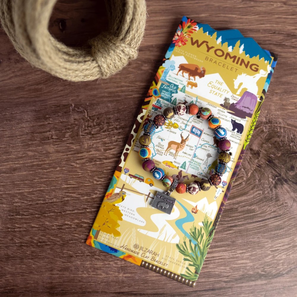DESTINATION WYOMING Clay Bracelet by JILZARAH Description: 8mm handmade clay beads. Antique finish silver spacers. Grand Teton, Ranch Life, Jackalope, Wheat, Fishing, Yellow Stone, Rocky Mountains. WYOMING Charm. Strung on 1.2mm industrial strength elastic cord. 6.75" - 7" diameter. FREE SHIPPING!!! *JILZARAH Beads are handmade from smooth layers of clay, slowly rolled down to size while keeping the design. The clay is then rolled by hand into beads and made into beautiful designs. *JILZARAH Beads can be cleaned with hot water and laundry detergent. Use a small tooth brush to scrub clean and dry with a soft cloth. ***Buy your JILZARAH Beads from an official JILZARAH Bead dealer!*** Thank you for looking!!! CHECK OUT OUR EBAY STORE FOR MORE SELECTIONS!
