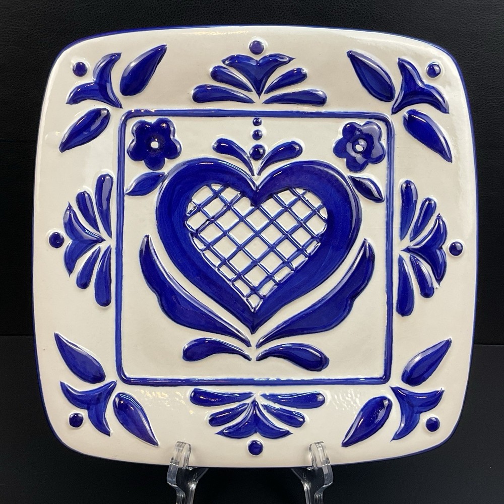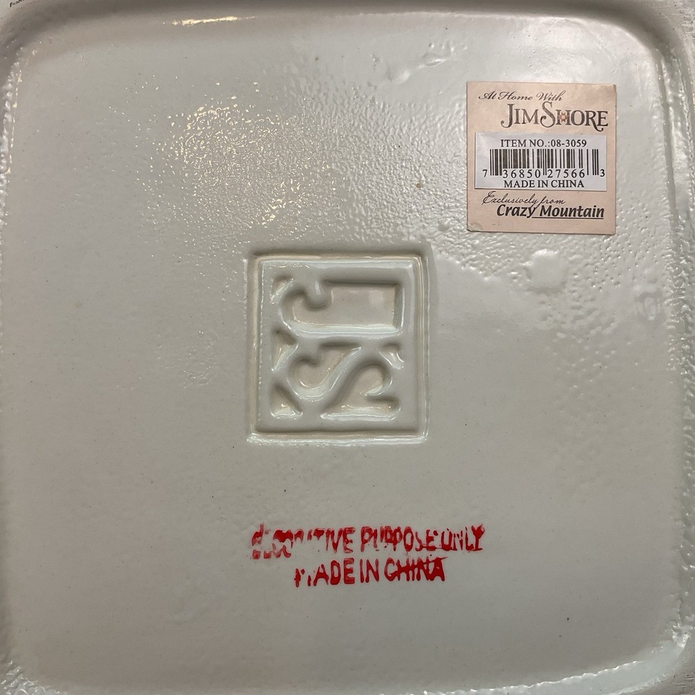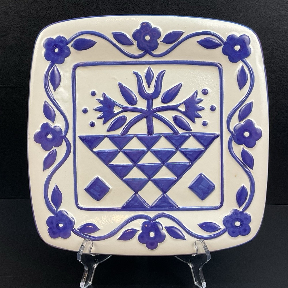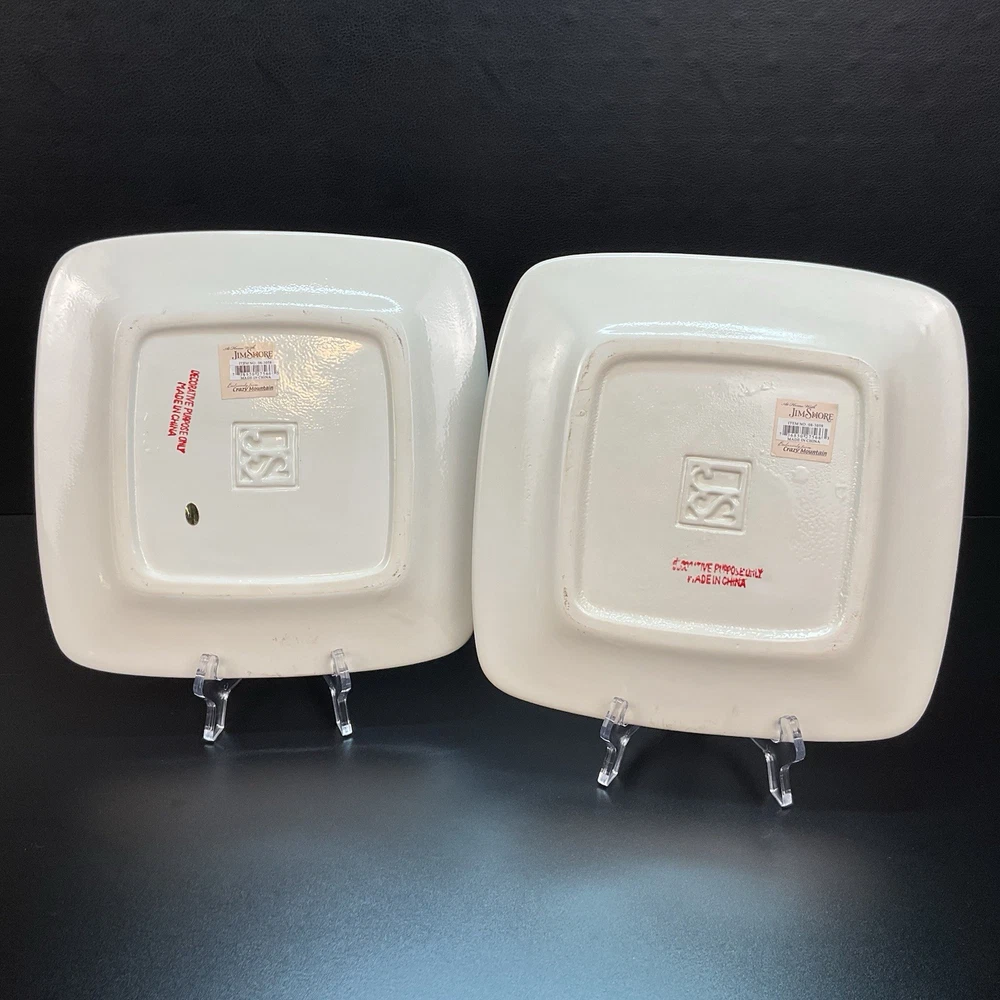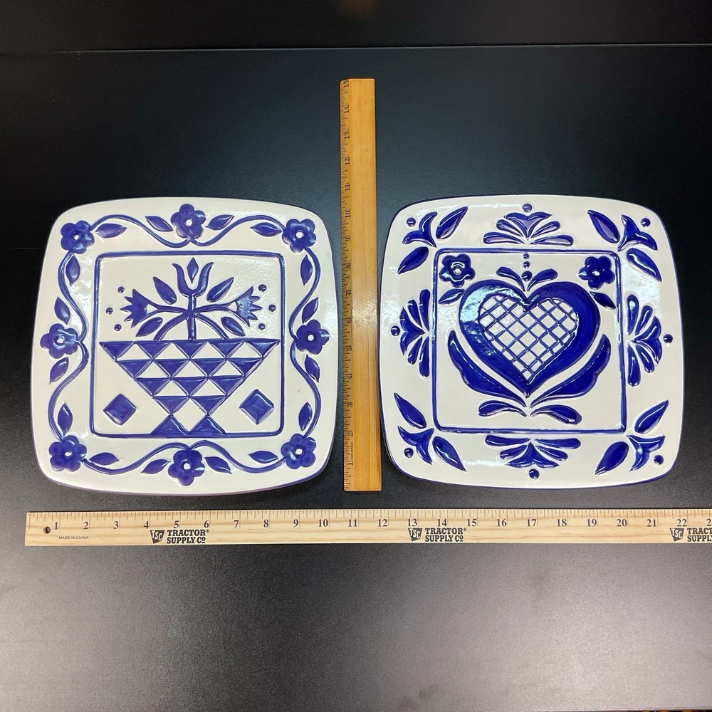 Set of two Jim Shore 10” x 10” decorative plates with blue and white folk style quilt block designs. Item number 08-3059, made in China, exclusively from Crazy Mountain. While both plates are blue, the plate with the heart design is darker blue while the other plate’s blue has a purplish tint to it. Also, the floral plate has a small chip on the rim, which is included in the photos. Selling in good preowned condition. Please see photos for measurements and additional details.