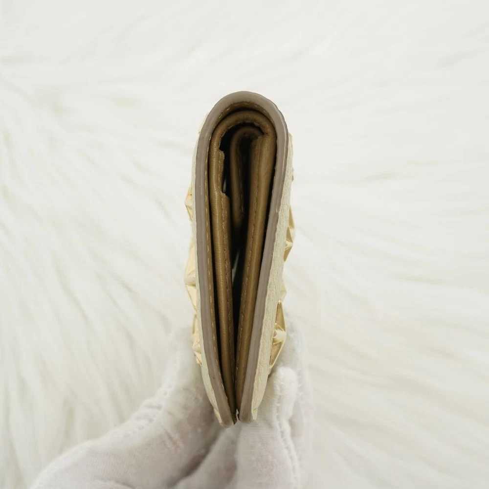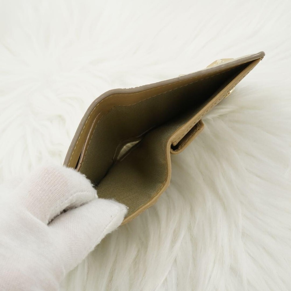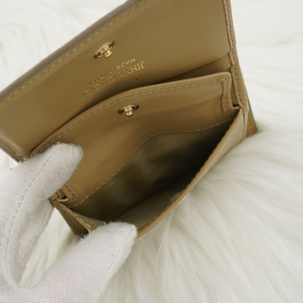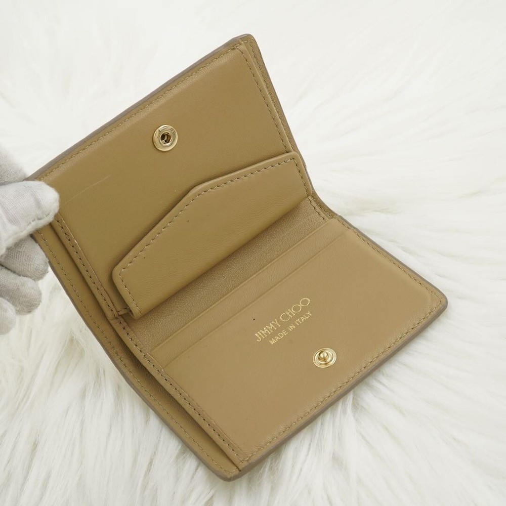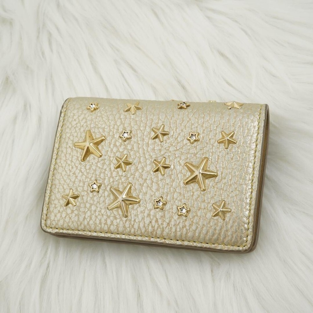 This Jimmy Choo folding mini wallet is stunning—the gold studs and star detailing make it a standout piece! It's compact yet functional with three card pockets, a coin purse, and a bill compartment. At 10.5x7x2cm, it fits perfectly in small bags. Barely used, it looks brand new with no scratches or stains. Free shipping from Japan is a huge plus, just double-check the size before ordering. A gorgeous second-hand find for a great price!