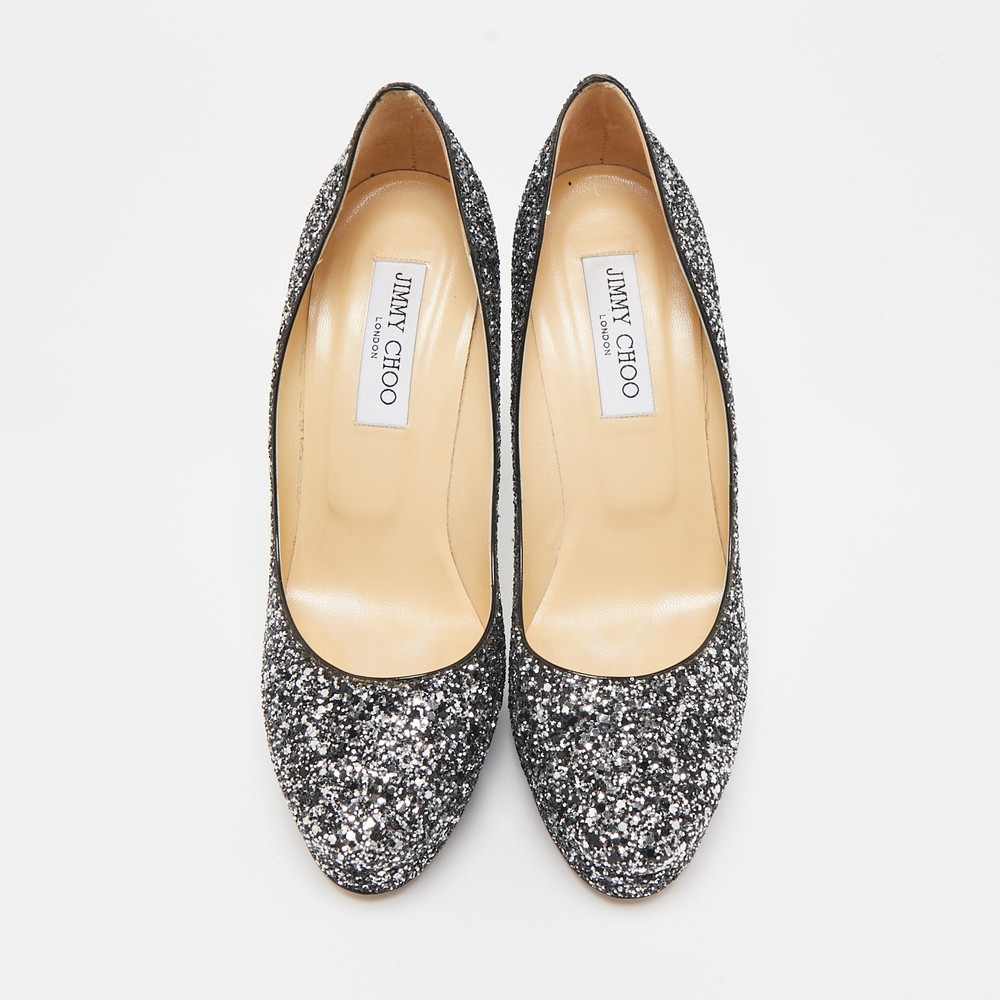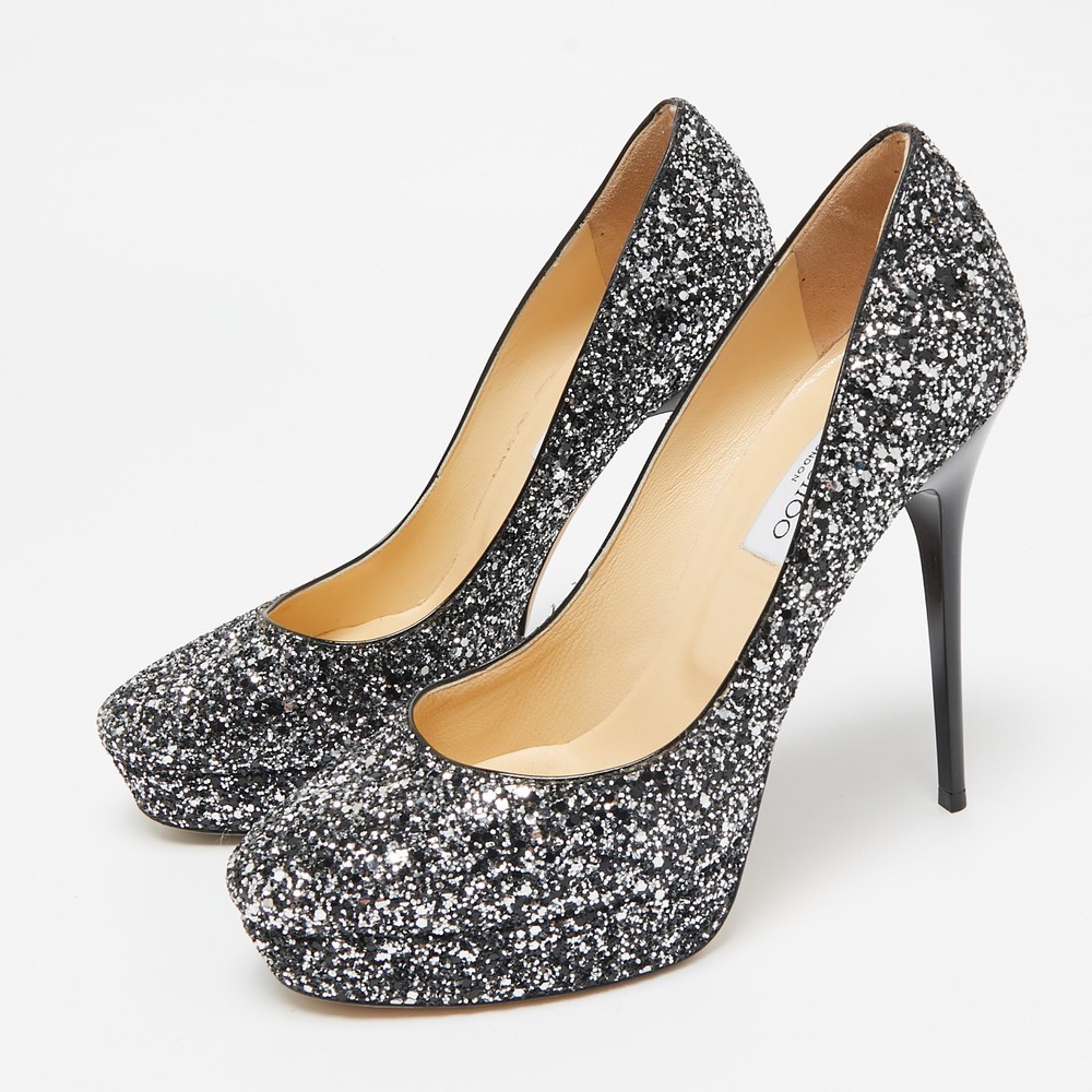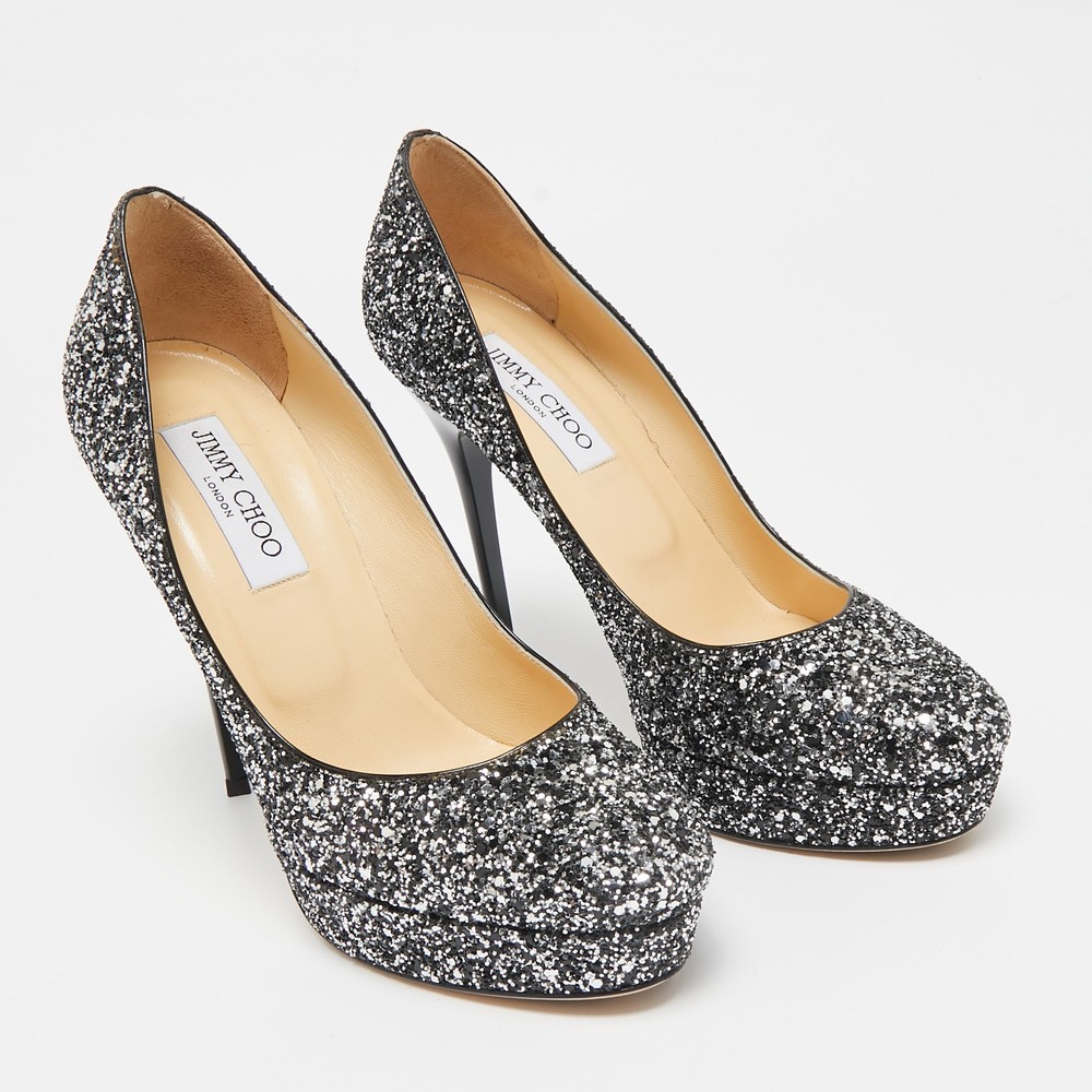 Make a chic style statement with these designer pumps. They showcase sturdy heels and durable soles, perfect for your fashionable outingsCertified by The Luxury Closet - This item has gone through a detailed authentication process overseen by our experts. We offer a lifetime guarantee of authenticity on all our items. Import duties, taxes and charges are not included in the item price. These charges are the buyers responsibility. Please check with your country’s customs office to determine what these additional cost will be prior to buying. Our eBay Store About Us Contact Us Add to Favorite Sellers Jimmy Choo Silver/Black Glitter Cosmic Platform Pumps Size 39.5 $171.6 Make a chic style statement with these designer pumps. They showcase sturdy heels and durable soles, perfect for your fashionable outings Product Details Brand Color Silver Dimensions Material Glitter Size 39.5 Outsole Width 7 cm Outsole Length 22 cm Heel Height 13 cm Includes Original Box, Original Dustbag Certified by The Luxury Closet This item has gone through a detailed authentication process overseen by our experts. We offer a lifetime guarantee of authenticity on all our items. How We Check The in-house team of experts at The Luxury Closet is highly trained to verify the authenticity and the condition of the luxury products. They ensure that only 100% authentic items are put on sale.The evaluation process is unique with its own mix of assessment criteria and differs according to the category. Each item is evaluated based on the following combination of hallmarks, hardware, stitching, symmetry, material, craftsmanship, stamping, codes, hologram stickers, and packaging. Our authenticators also check if the items have been modified or amended (e.g., aftermarket diamonds, replaced batteries, repaired bags, etc.) International Buyers Import duties, taxes and charges are not included in the item price. These charges are the buyers responsibility. Please check with your country’s customs office to determine what these additional cost will be prior to buying.