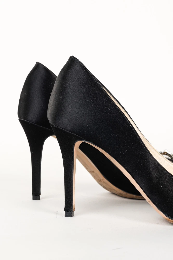 Circa 2016, the Veil 85 pumps from Jimmy Choo are crafted in a black satin, and are embellished with crystal bows on the vamps. They feature covered stiletto heels, closed pointed toes, and leather lining and soles. Size: 38 (US 7.5) Condition: Excellent; very light marking on upper, very light scratching on toes, light signs of wear on insoles, moderate wear on outsoles. Comes with dustbag and box. Approximate Measurements: Insole Length: 9.5” (24 cm) Heel Height: 3.5” (9 cm) Composition: Satin upper, crystal embellishments, leather lining and soles.