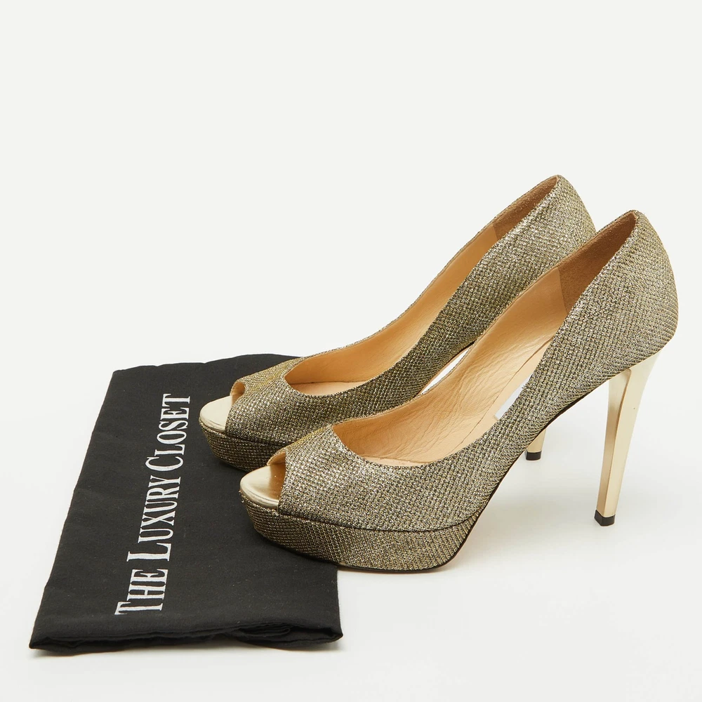 Make a chic style statement with these designer pumps. They showcase sturdy heels and durable soles, perfect for your fashionable outingsCertified by The Luxury Closet - This item has gone through a detailed authentication process overseen by our experts. We offer a lifetime guarantee of authenticity on all our items. Import duties, taxes and charges are not included in the item price. These charges are the buyers responsibility. Please check with your country’s customs office to determine what these additional cost will be prior to buying. Our eBay Store About Us Contact Us Add to Favorite Sellers Jimmy Choo Metallic Gold Lurex Fabric Peep Toe Platform Pumps Size 39.5 $188.1 Make a chic style statement with these designer pumps. They showcase sturdy heels and durable soles, perfect for your fashionable outings Product Details Brand Color Gold Dimensions Material Metallic Lurex Fabric Size 39.5 Outsole Width 6.5 cm Outsole Length 24.5 cm Heel Height 11.5 cm Includes The Luxury Closet Packaging Certified by The Luxury Closet This item has gone through a detailed authentication process overseen by our experts. We offer a lifetime guarantee of authenticity on all our items. How We Check The in-house team of experts at The Luxury Closet is highly trained to verify the authenticity and the condition of the luxury products. They ensure that only 100% authentic items are put on sale.The evaluation process is unique with its own mix of assessment criteria and differs according to the category. Each item is evaluated based on the following combination of hallmarks, hardware, stitching, symmetry, material, craftsmanship, stamping, codes, hologram stickers, and packaging. Our authenticators also check if the items have been modified or amended (e.g., aftermarket diamonds, replaced batteries, repaired bags, etc.) International Buyers Import duties, taxes and charges are not included in the item price. These charges are the buyers responsibility. Please check with your country’s customs office to determine what these additional cost will be prior to buying.