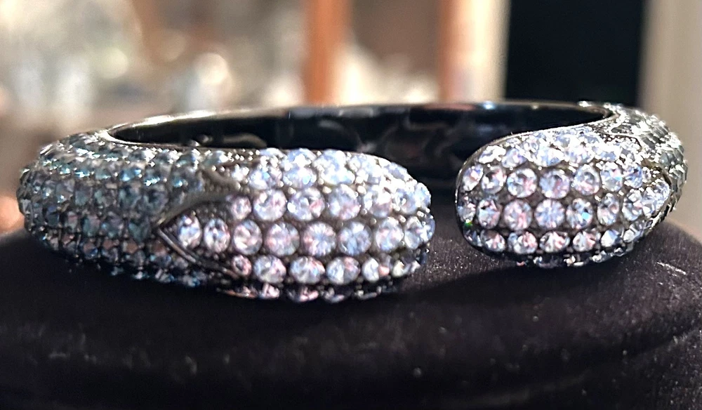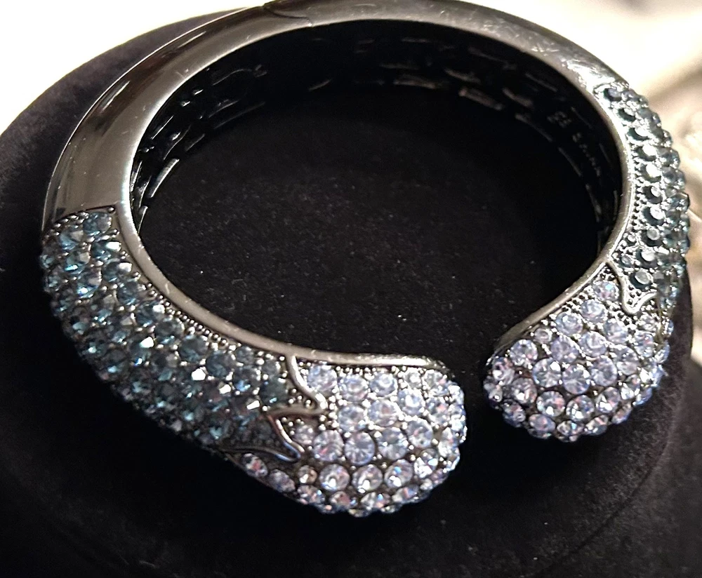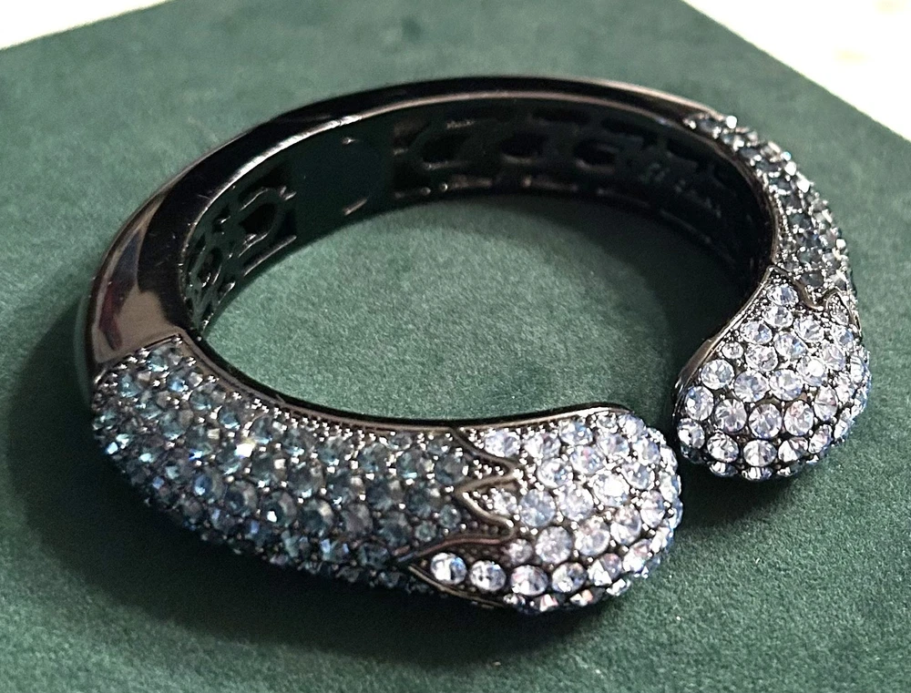 This Joan Boyce cuff bracelet is a statement piece, echoing whispers of elegance and sophistication. Adorned with sparkling blue Swarovski crystals, it mimics the night sky. The black metal adds a touch of mystery, while the hinged design offers ease of wear. A timeless accessory for those who appreciate the allure of crystalline beauty. • Hinged design for secure fit • Sparkling blue crystals • Elegant and sophisticated style • Black metal construction • Timeless and versatile Diameter: 2.5 inches