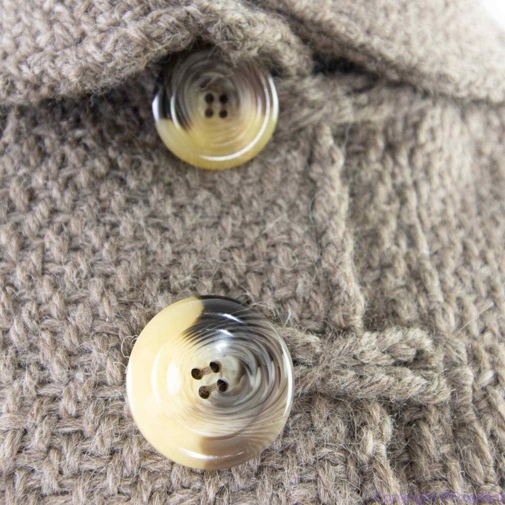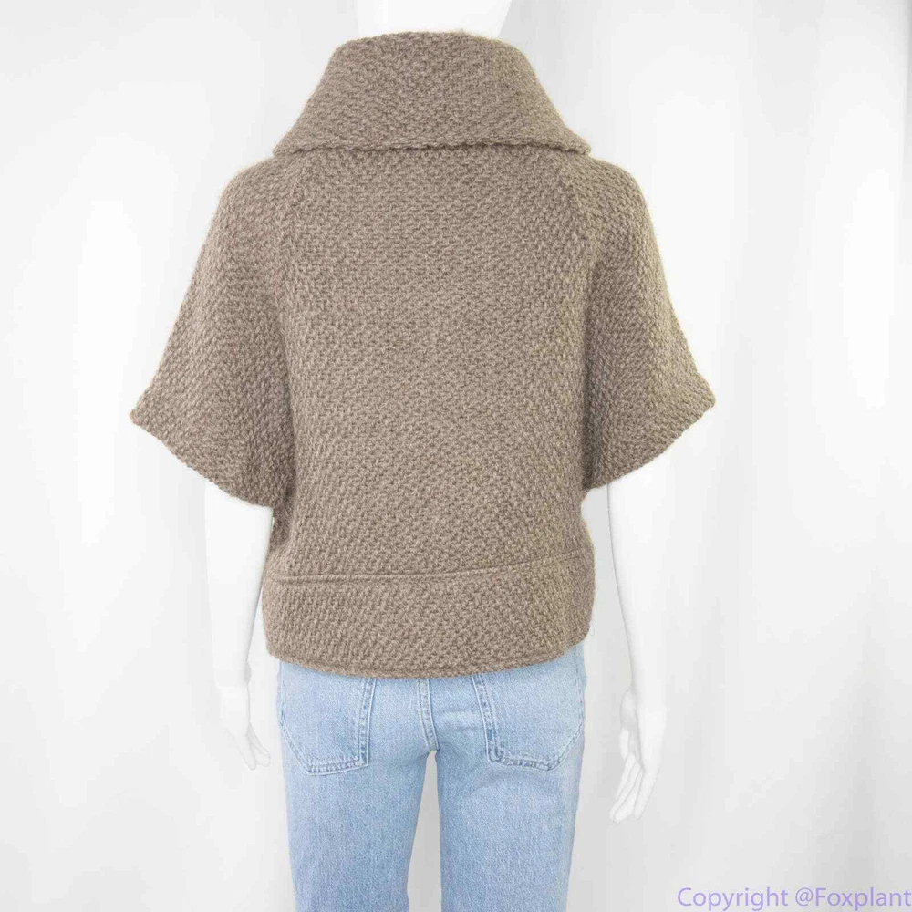 Women's Wool Alpaca button front short sleeves cardigan by John Branigan Branigan weavers Wool Alpaca Big retro button Curvy design front Poncho style Round collar Made in Ireland Materials: 85% Wool, 15% alpaca One size. Please check approx. laid flat measurements before purchasing: Back length from high point of shoulder down: 20 1/2'' Excellent condition. No noticeable flaws or stains or damages.