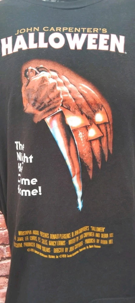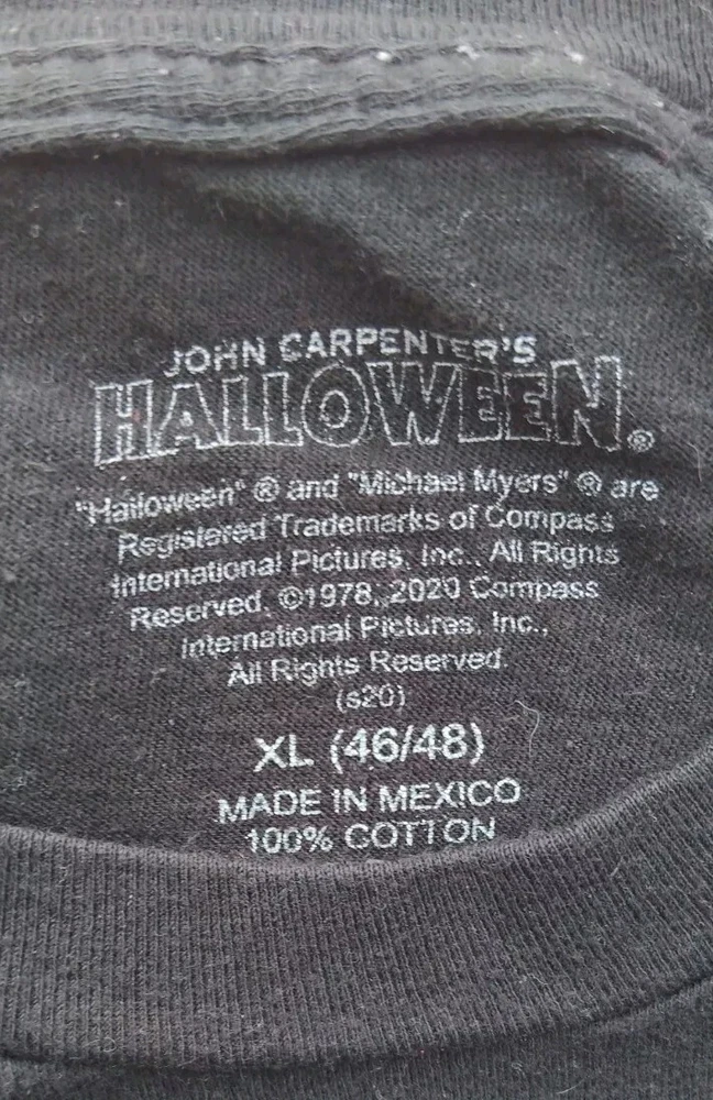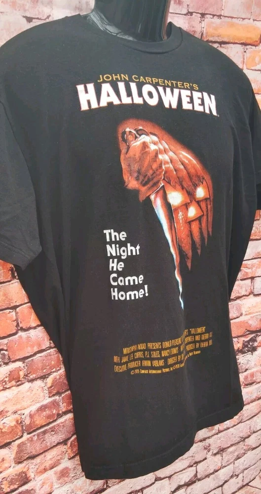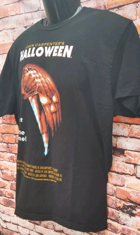 Show off your love for the iconic horror movie, John Carpenter's HALLOWEEN, with this limited edition movie poster t-shirt. Featuring Michael Myers in a menacing presence, this shirt is perfect for any fan of the genre. Made from comfortable, preshrunk cotton, it is easy to care for and packable for any season. The black t-shirt has a regular fit and short sleeves, with a crew neckline that adds a touch of classic style. The shirt is adorned with the movie's logo and a bold graphic print that captures the essence of the film. Perfect for any occasion, this t-shirt is a must-have for any horror movie enthusiast. If you like this item, but don't like the price, please feel free to contact me anytime/and or make an offer. Thank You
