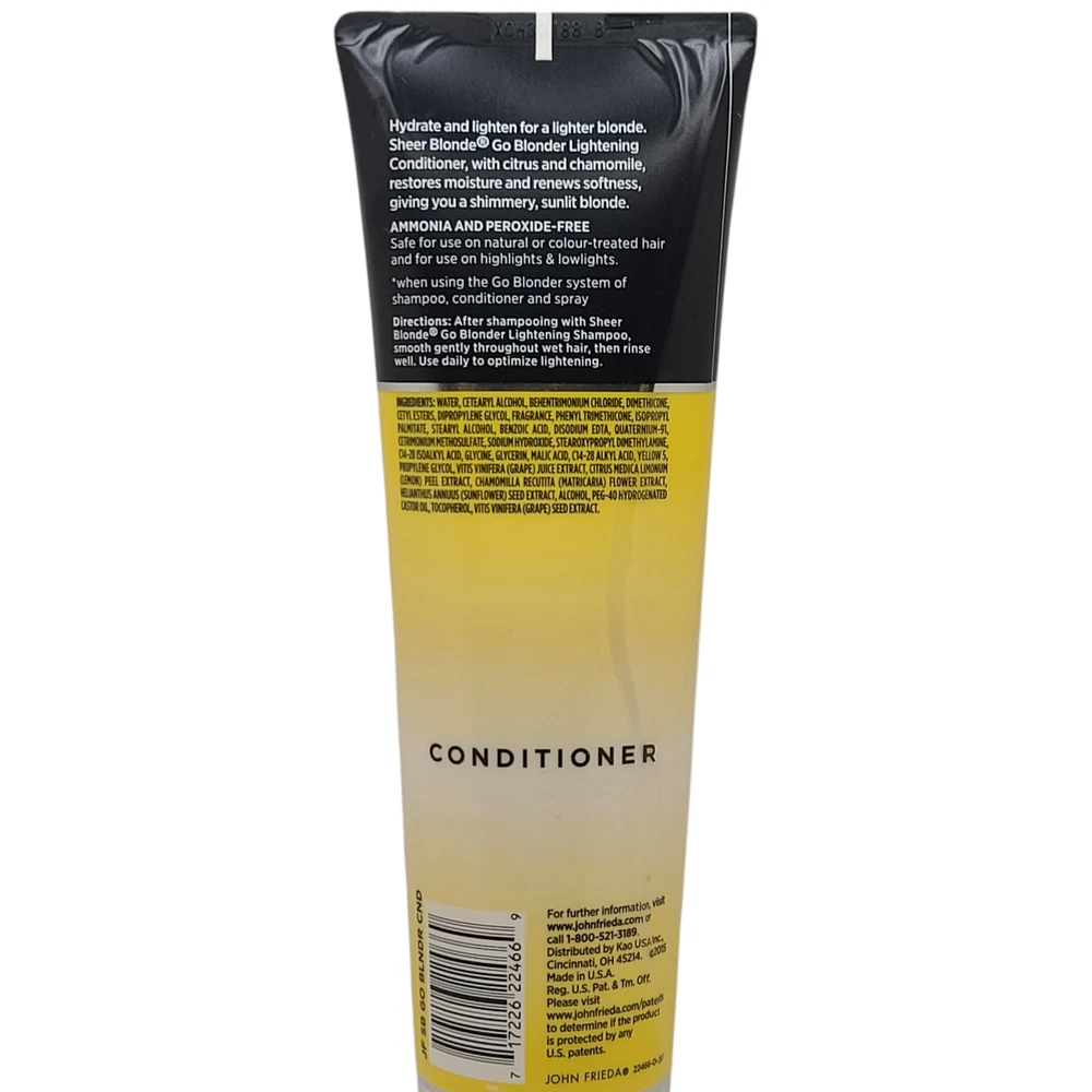 KleverKosmetics Our eBay Store About Us Contact Us Add to Favorite Sellers John Frieda Go Blonder Lightening Conditioner 8.3 oz *Packaging May Vary* ** Packaging May Vary ** John Frieda's Go Blonder Lightening Conditioner is designed to gradually lighten and brighten natural, color-treated, or highlighted blonde hair. Infused with citrus and chamomile, this conditioner not only enhances your hair's natural highlights but also restores moisture for a sun-kissed glow. It's gentle enough for daily use and free from ammonia and peroxide, ensuring your hair remains healthy and vibrant. Gradual Lightening: Gently lightens blonde hair over time, providing a natural, sun-kissed look. Safe for Daily Use: Free from ammonia and peroxide, making it suitable for everyday application without damaging hair. Color-Treated Hair Friendly: Ideal for natural, color-treated, or highlighted blonde hair, helping to maintain and boost color vibrancy. Moisture Restoration: Replenishes and maintains hair's moisture balance, leaving it soft and manageable. Natural Ingredients: Formulated with a blend of citrus and chamomile to enhance brightness and shine. Return and Refund Information • Please be aware that colors on the screen may appear slightly different in person. • Please be familiar with product. Feel free to contact us if you have any questions. • DUE TO HEALTH AND SANITARY ISSUES CONCERNING COSMETICS OR SKINCARE WE DO NOT ACCEPT RETURNS ON THESE ITEMS. ALL SALES ARE FINAL. • WE WILL ONLY ACCEPT RETURNS WHEN THE ERROR IS ON OUR END. • Attention VeRO members: We're not affiliated with or endorsed by the companies mentioned in this listing. All trademarks and copyrights are acknowledged, they are only used for informative description of the items offered for sale. Warranty information We are not an authorized dealer of this product and any warranty included with the product may not be honored by the manufacturer.