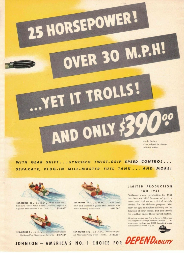 Original 1951 2 page Johnson Sea Horse Outboard Motors Vintage Ad Approximately 8 1/2" x 11" Excellent condition Will be shipped in a magazine bag with backing board and cardboard to prevent damage during shipping. **FREE SHIPPING** All of my items are ORIGINAL not reprints, reproductions etc. Please look at the photo(s) and ask any questions you might have before bidding.
