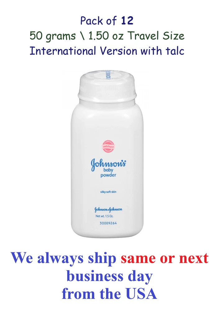 We ship same or next business day from the USA You will receive 12 Johnsons Baby Powder Talc 50g / 1.5oz Travel Size of the International version product container design might differ slightly than image About this product Johnsons baby powder keeps skin comfortable, dry & feeling soft. With a clean, classic scent, this baby powder formula glides over your baby’s skin and leaves it feeling delicately soft and dry while providing soothing comfort. Clean, classic scent. Dermatologist-tested. Hypoallergenic; formulated to be gentle, never harsh. Clinically Proven Mildness formula, is designed for baby’s delicate skin.