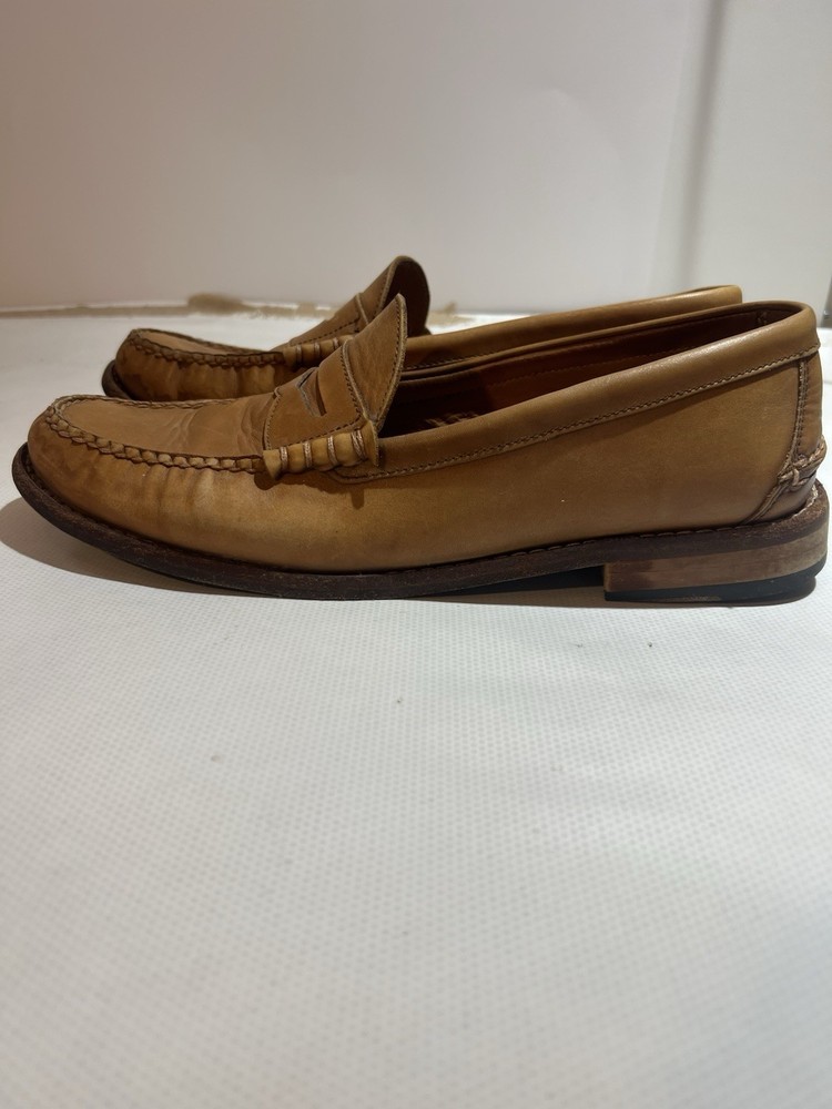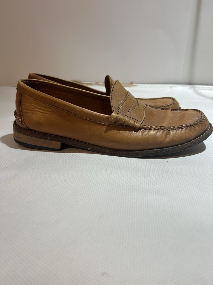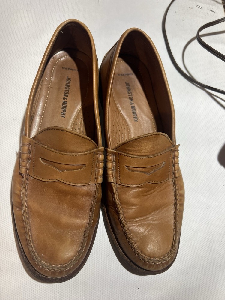 This product is a pair of Johnston & Murphy leather brown men's penny loafers in size 11. The loafers are lined with sheepskin for added comfort and warmth, making them a stylish and practical choice for dressy occasions. The slip-on closure and solid brown color add a touch of sophistication, while the classic penny style gives them a timeless look. Made with high-quality, sheepskin leather and featuring a comfortable M width, these loafers are a perfect addition to any man's wardrobe.