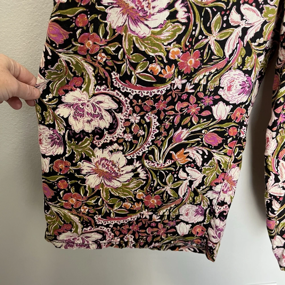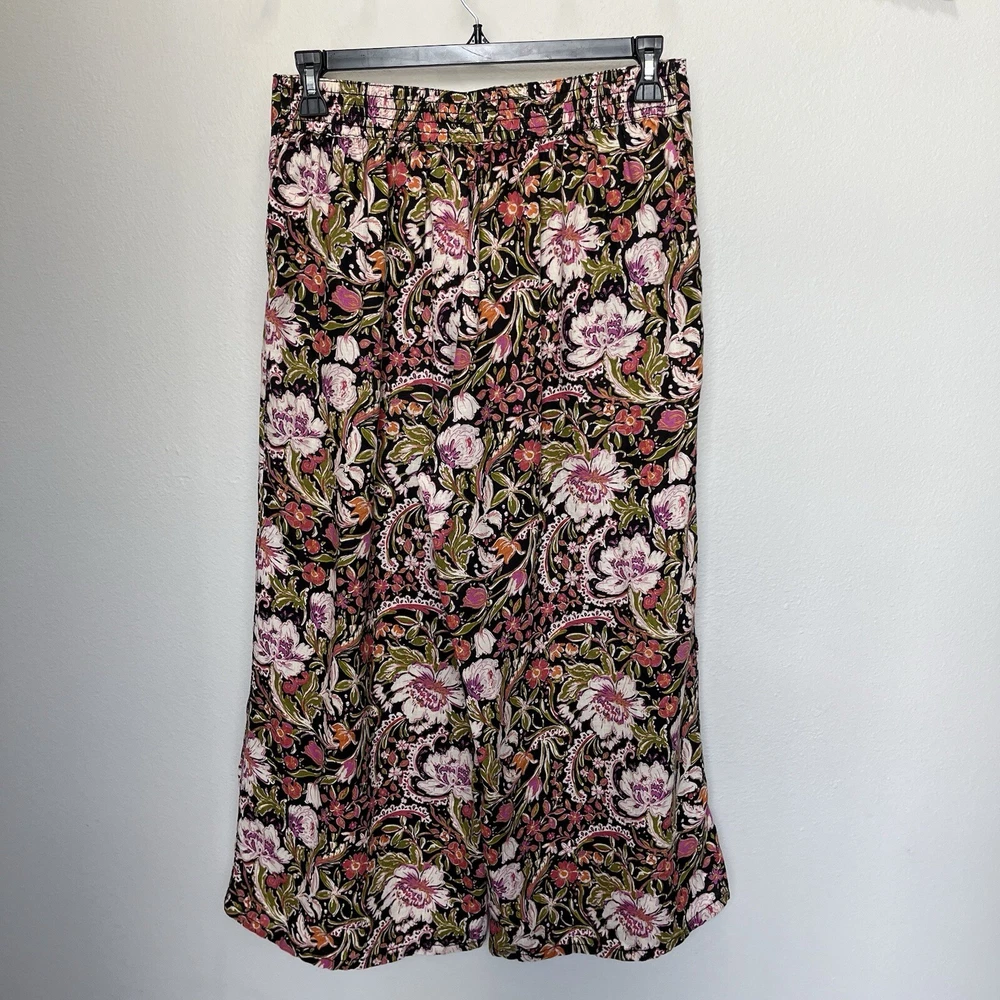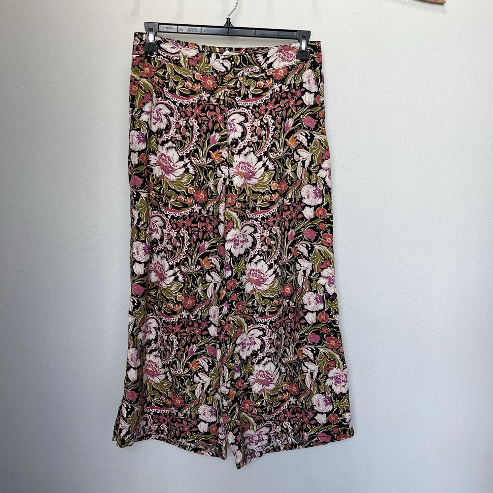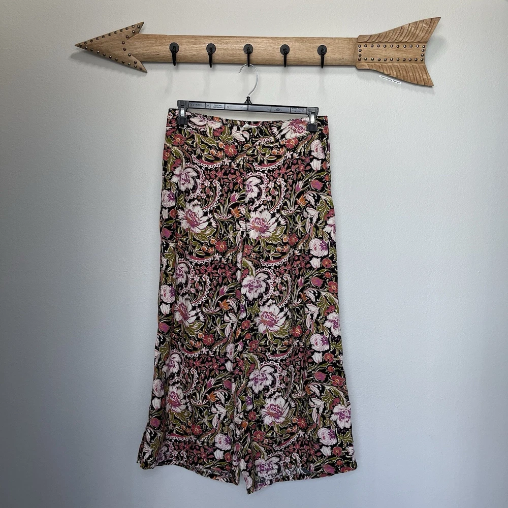 Get ready to embrace the bohemian spirit with these stunning Joie wide-leg pants. Made of 100% linen, these ankle-length pants feature a high-rise waist, flat front, and back elastic for a comfortable fit. The pull-on closure and multicolor dark floral pattern make them perfect for any casual or travel occasion. These pants are a must-have for any summer or spring wardrobe, with a relaxed fit and a 24-inch inseam. The linen fabric type ensures breathability and comfort, while the wide-leg style adds a touch of sophistication. Whether you pair them with a simple tee or a statement blouse, these pants will elevate any outfit. In excellent condition, look almost new Measures approximately 16” across waist laying flat with a 24” inseam and a 12.5” rise 4