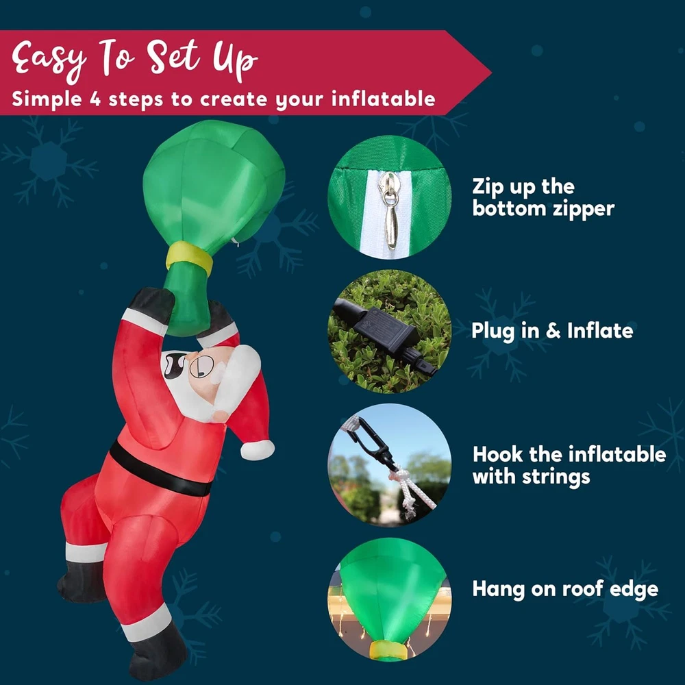 Joiedomi 8 FT Tall Christmas Inflatable Falling Santa with Gift Bag, Blow Up Christmas Hanging Santa Inflatables Outdoor Decoration with Build-in LEDs for Xmas Party Outdoor Indoor Yard Garden Decor Item Description Outstanding Design. This inflatable decoration features a whimsical and humorous design of Santa in a falling pose with a gift bag, complete with a comically terrified expression. This unique and playful design will undoubtedly bring joy and laughter to your holiday setup, making it a standout piece in your Christmas decor. Product size 2.5 x 3 x 8 feet. This inflatable comes with an extended cord, ground stakes, fastened ropes, built-in sandbags, and a plug with UL certification. Powerful Features. Equipped with built-in LED lights, this falling inflatable Santa ensures your holiday display is bright and eye-catching. The energy-efficient LEDs provide a warm and festive glow, enhancing the charm of Santa's hilarious falling pose and making your decoration visible and appealing both day and night. UL Certified. Safety is our top priority. This blow up falling Santa decoration is UL certified, meaning it meets rigorous safety standards. You can enjoy peace of mind knowing that this product is safe for use in various environments, both indoors and outdoors. Versatile Use. Ideal for a variety of settings, this falling Santa inflatable is perfect for yards, gardens, patios, or even indoor spaces. Its charming and festive design, combined with its glowing lights, makes it a versatile addition to any Christmas decor theme, spreading holiday cheer wherever it's placed. Easy to Use. Designed for convenience, this Xmas inflatable decoration is easy to set up and take down. It comes with all necessary components for quick installation and deflation, allowing you to effortlessly create a delightful holiday display and store it away with ease when the season is over. › See more product details Payment We accept payment only through PAYPAL Shipping We ship products worldwide through standard express courier service, it will reach within 7 to 10 days to abroad buyers, we ship the product after recieved clear payment and give full information about shipment to the buyer Return We accept product return within 7 to 21 days from delivery date but product should be in original position and not in damaged condition,the return shipping charges will be buyer responsibility