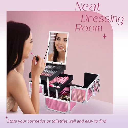 Joligrace Makeup Train Case Makeup Case Organizer Portable Cosmetic Box Storage with 2 Trays Mirror Locking Make Up Travel Case for Nail Kits Cosmetics Craft Traveling Makeup Box Mermaid Pink LuxeFusion Product Description Features Mermaid Pink Makeup Box: Makeup box measures 9.44 x 6.69 x 7 inches, making it an ideal size for travel. Made from high-quality materials, it combines sturdy ABS aluminum with metal-reinforced corners for excellent durability. Despite its strong construction, the box is lightweight and easy to carry. Its waterproof, glittery pink surface not only looks stylish and eye-catching but also protects your makeup from moisture and other outdoor elements. The unique color subtly changes and reflects light from different angles, adding both beauty and practicality. Makeup Train Case with Mirror: This makeup train case features an extendable cantilever 2-tier tray design that provides ample space for organizing your cosmetics efficiently. In addition, it includes a convenient mirror attached to the top tray, allowing you to view all your items at once. This thoughtful design enables you to access your makeup easily and speeds up your dressing routine, making the process quicker and much more straightforward. Makeup Case Easy and Convenient Cleaning: The tray bottom and case bottom are covered with stainproof plastic films, making cleaning quick and simple. These films prevent spills from soaking in and protect against scratches from everyday use. If your lipstick stains the trays, simply wipe the area gently with a damp cloth. After cleaning, the trays will look fresh and spotless, just like new. This smart design makes keeping your trays clean effortless, saving you time and effort. Portable & Lockable Makeup Organizer: This portable makeup organizer is designed for convenience and security. Its compact size makes it easy to carry, perfect for travel or moving your cosmetics. A comfortable, non-slip handle ensures a secure grip even when fully loaded. The sturdy lockable mechanism with key provides added privacy and protection, keeping your makeup safe from unauthorized access. Ideal for travel or shared spaces, this case offers peace of mind and reliable security for your personal beauty items. For Your Beloved: This stylish makeup case is the perfect way to keep her vanity tidy while adding a touch of sophistication. It’s more than just a storage solution—it’s a present that holds both makeup and memories. Ideal for Valentine’s Day, Christmas, birthdays, or any occasion, this practical and heartfelt present will be loved by those you care about, bringing happiness and neatness. Product Details Product Dimensions : 9.44 x 7 x 6.69 inches; 3.4 Pounds Item model number : M87 Department : Women Manufacturer : Joligrace 🚚 Free Shipping All orders ship free and fast to your doorstep. 🔁 Easy Returns Satisfaction guaranteed. 30-day returns, no questions asked. 💬 24/7 Support Contact us anytime; we’re here to help, day or night. Brought to you by LuxeFusion – Quality you can trust.