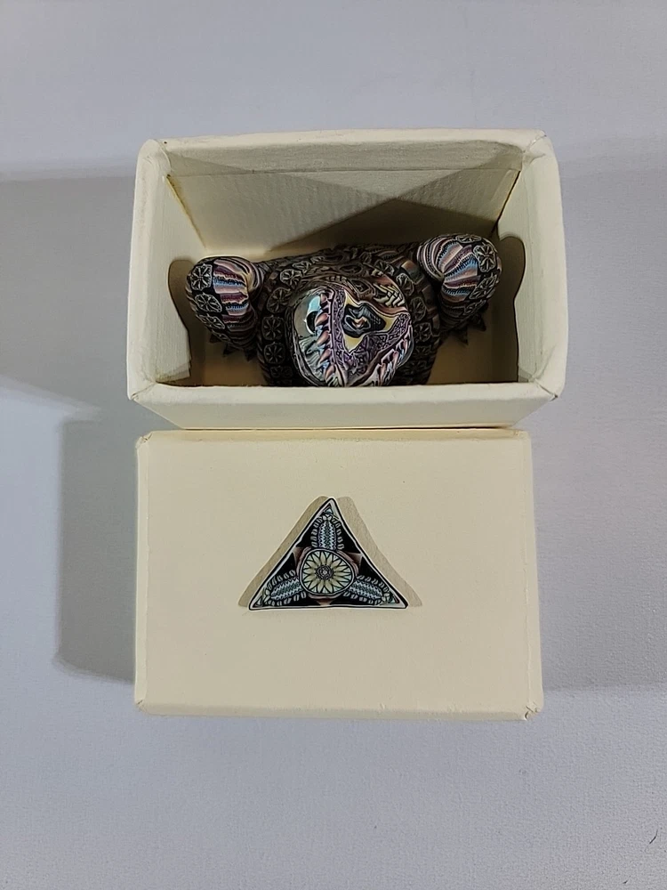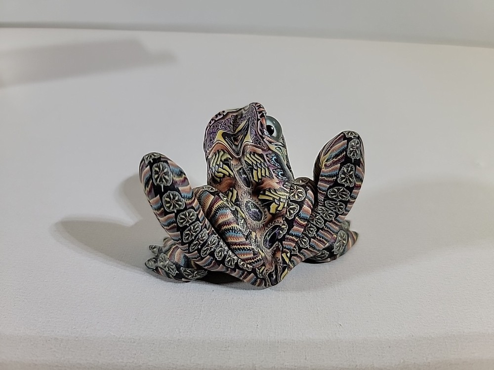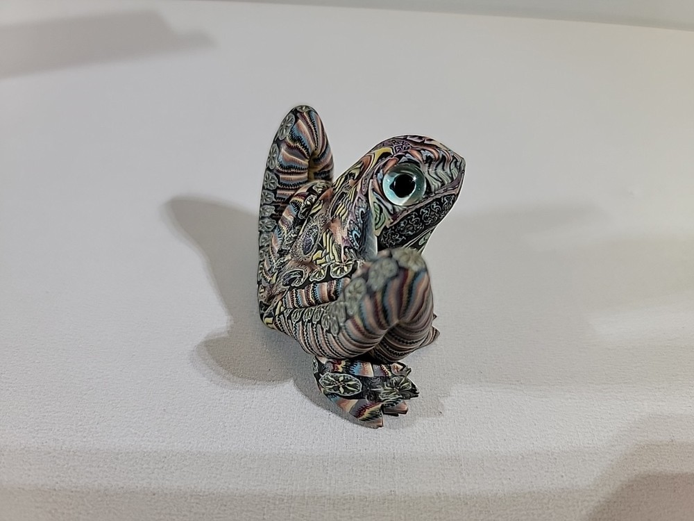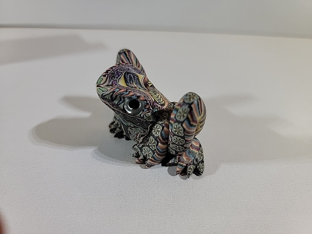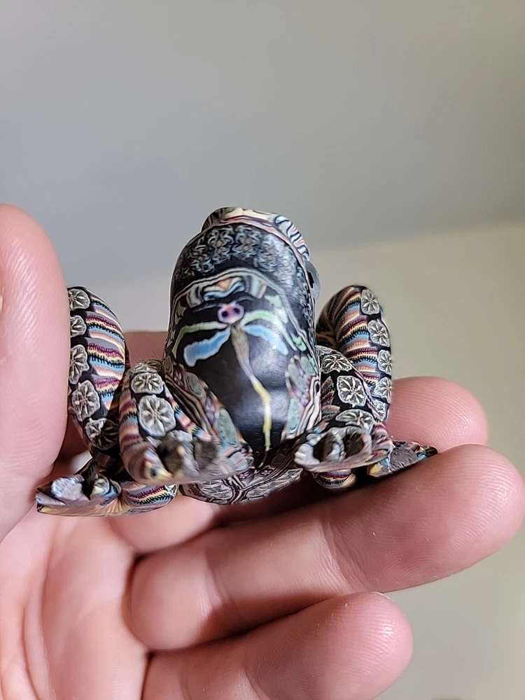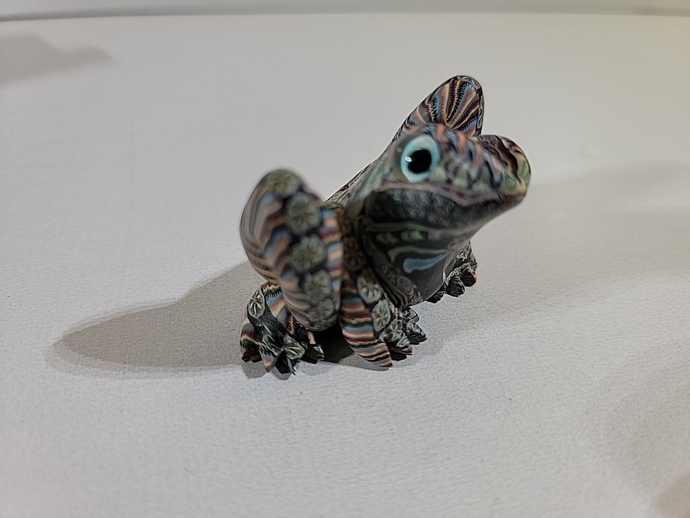 Jon Stuart Anderson small frog sculpture features many floral elements and Dragonfly's with many delicate details applied throughout the friendly creature.
