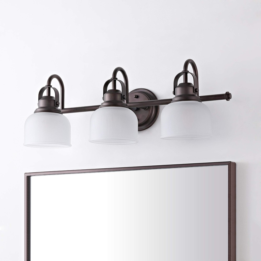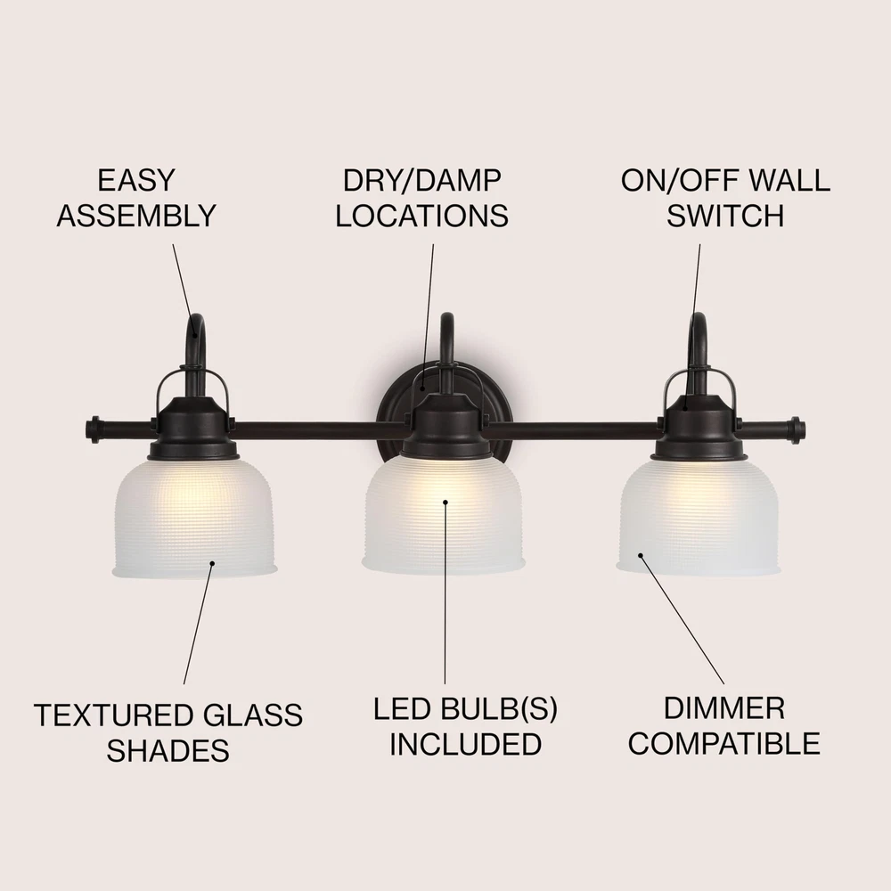 JONATHAN Y JYL7409C Virginia 25.25" 3-Light Metal/Glass LED Traditional Classic Vanity Light Modern 2700K LED 4W Bulbs Entryway Lobby Kitchen Bathroom Bedroom Living Room Hallway, Oil Rubbed Bronze Technical Details Brand JONATHAN Y Color Oil-Rubbed Bronze Material Glass, Metal Style Traditional Light fixture form Vanity Room Type Entryway, Bathroom, Kitchen, Living Room, Hallway Product Dimensions 25.25"L x 9"W x 9"H Specific Uses For Product Bathroom, Kitchen, Entryway, Living Room Indoor/Outdoor Usage Indoor Power Source AC Installation Type Semi Flush Mount Special Feature Corded Control Method Touch Light Source Type Incandescent Finish Type Oil Rubbed Shade Material Glass Number of Light Sources 3 Voltage 120 Volts Light Color Warm White Shape Round Included Components Lighting Fixture Lighting Method Downlight Specification Met ETL Item Weight 8.1 Pounds Number of Items 1 Wattage 40 watts Bulb Base E26 Controller Type Push Button Switch Type Touch Unit Count 1.0 Count Water Resistance Level Not Water Resistant Brightness 420 Lumen Efficiency Energy Efficient Mounting Type Wall Mount Shade Color Clear Fixture Type Non Removable Assembly Required Yes Manufacturer JONATHAN Y UPC 840011412061 Recommended Uses For Product for Bathroom, Hallway, Living Room, Bedroom, Mirror Cabinet Model Name Virginia Metal Glass LED Vanity Light Bedroom Livingroom Bathroom Hallway Item Weight 8.14 pounds Country of Origin China Item model number JYL7409C Size 3 Light Finish Oil Rubbed Item Package Quantity 1 Number Of Pieces 1 Cutting Diameter 25.25 Inches Plug Format A- US style Special Features Corded Average Battery Life 50000 Hours Assembled Diameter 25.25 Inches QUALITY CONSTRUCTION: Wall light fixtures are used as general lighting; Available in amazing variety; Replacing old, outdated wall lights is a fast and affordable way to update your home design ENERGY-SAVING LED BULBS INCLUDED: LED bulbs are included with every light fixture; All of our lighting is ETL Listed and meets 120-volt UL standards for safety and quality; Professional installation is recommended for all wall light fixtures SATISFACTION GUARANTEED: Every JONATHAN Y design is created with uncompromising attention to detail, using only the highest quality components; Based in Soho, New York, designer Jonathan and his talented team create affordable high-end home decor Textured glass and brushed oil rubbed bronze come together to create a chic, classic combination for this vanity light Takes three bulbs and compatible with any 9W LED or 40W Type "A" or 13W CFL With a hint of texture on the glass shade to blur the glare of the bulb, this elegant sconce is perfect for a bathroom or vanity setting that calls for bright, but not harsh, light. Above a mirror or vanity, you'll find this stylish piece the perfect addition to your morning makeup routine, as it is compatible with a variety of bulbs. Also versatile within any style of decor, we particularly love seeing these in bathrooms and kitchens, where the arch of the light's arm is reminiscent of the curve of a beautiful faucet. Shipping We offer FREE shipping on all orders! We ship within Three business days of payment, usually sooner. We use a selection of shipping services such as UPS, FedEx, USPS etc. We only ship to the lower 48 states, no APO/FPO addresses or PO Boxes allowed. Local pickups and combined shipping options are not provided at this time. Return You can return a product for up to 30 days from the date you purchased it. Any product you return must be in the same condition you received it and in the original packaging. Please keep the receipt. Payment We accept payment by any of the following methods: PayPal Please pay as soon as possible after winning an auction, as that will allow us to post your item to you sooner! Feedback Customer satisfaction is very important to us. If you have any problem with your order, please contact us and we will do our best to make you satisfied. Contact Us If you have any queries, please contact us via ebay. We usually respond within 24 hours on weekdays. Please visit our eBay store to check out other items for sale! Thank you for shopping at our store.
