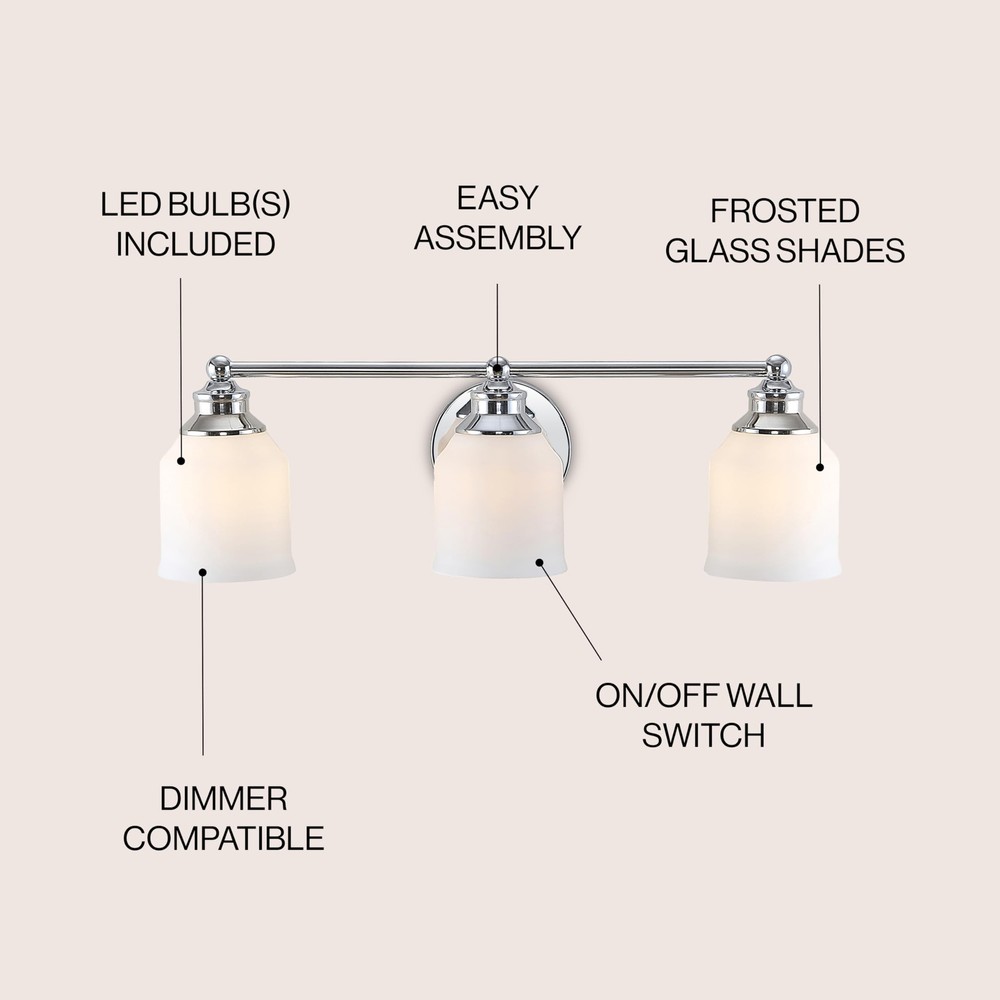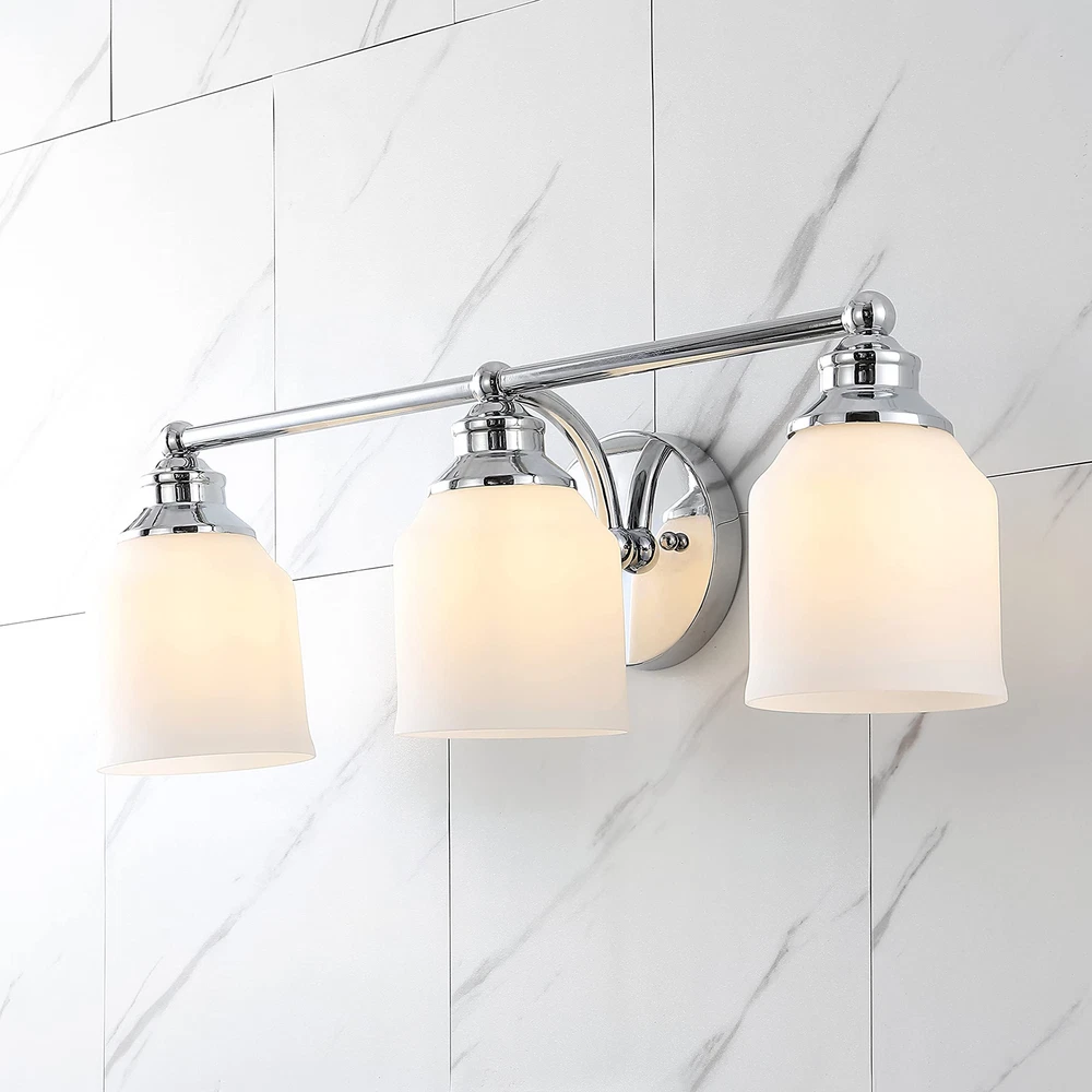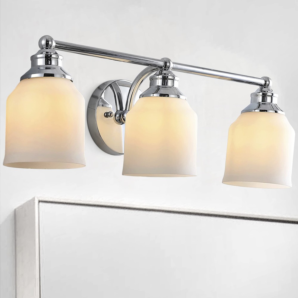 Elevate your urban apartment, cottage or farmhouse with our versatile take on a classic wall light. The included LED bulb casts a warm glow, providing plenty of light. The frosted glass bell shade and sparkling chrome finish add elegant vintage style to your bath vanity, or above a kitchen sink. QUALITY CONSTRUCTION: Wall light fixtures are used as general lighting; Available in amazing variety; Replacing old, outdated wall lights is a fast and affordable way to update your home design ENERGY-SAVING LED BULBS INCLUDED: LED bulbs are included with every light fixture; All of our lighting is ETL Listed and meets 120-volt UL standards for safety and quality; Professional installation is recommended for all wall light fixtures SATISFACTION GUARANTEED: Every JONATHAN Y design is created with uncompromising attention to detail, using only the highest quality components; Based in Soho, New York, designer Jonathan and his talented team create affordable high-end home decor Replace outdated wall sconces or vanity lights with this sparkling chrome classic for an instant style makeover Our light fixtures work with LED-compatible dimmers; professional installation is recommended