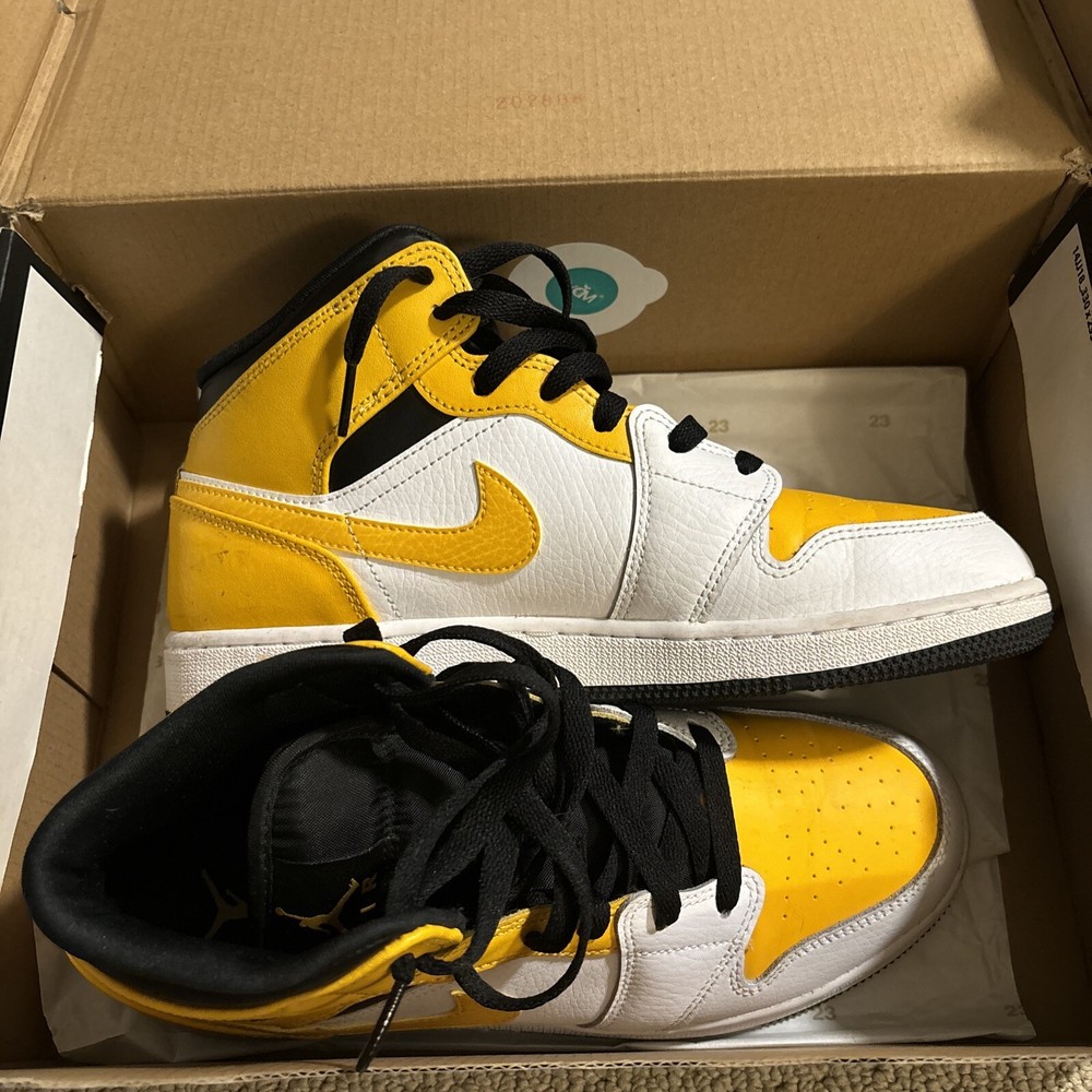 Jordan 1 Mid Yellow sneakers. Designed with a mid-top silhouette, these shoes are perfect for any casual or athletic occasion. The iconic Air Jordan product line ensures high-quality materials and construction, while the retro theme adds a touch of nostalgia to your outfit. Featuring a standard shoe width and size 8.5, these sneakers are made for men or women who appreciate both comfort and style. The vibrant yellow color and Michael character add a unique touch to these shoes, making them a must-have for any sneakerhead. Don't miss out on the opportunity to add these Jordan 1 Mid sneakers to your collection.