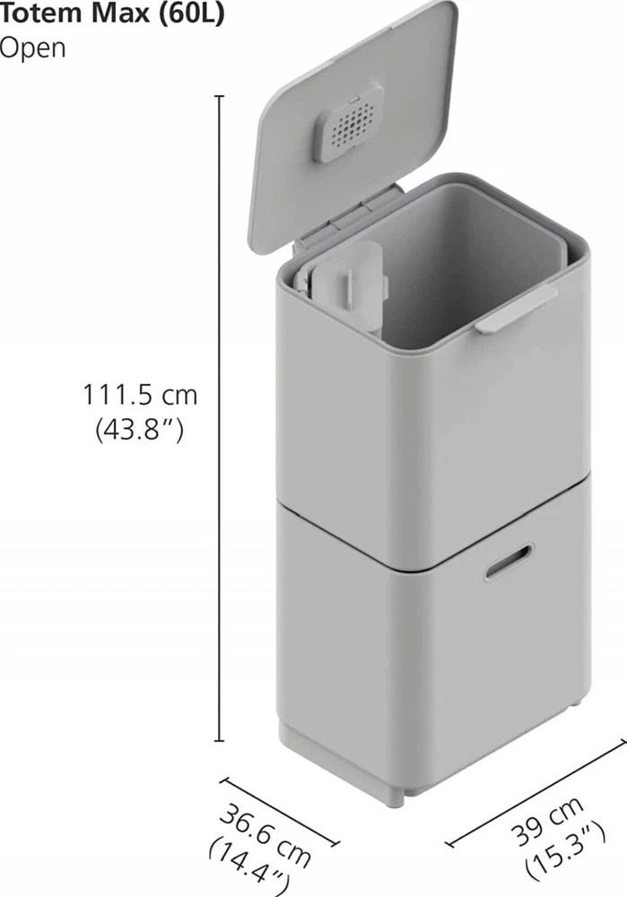 This Joseph Joseph Totem Max Waste & Recycling Bin in is a 60-liter capacity bin with two compartments for waste and recycling. It is square in shape, made of plastic material, and has a contemporary style with a white eggshell finish. The bin measures 18 inches in length, more than 24 inches in height, and 16 inches in width. It is free-standing and suitable for home organization in the kitchen or any household area.