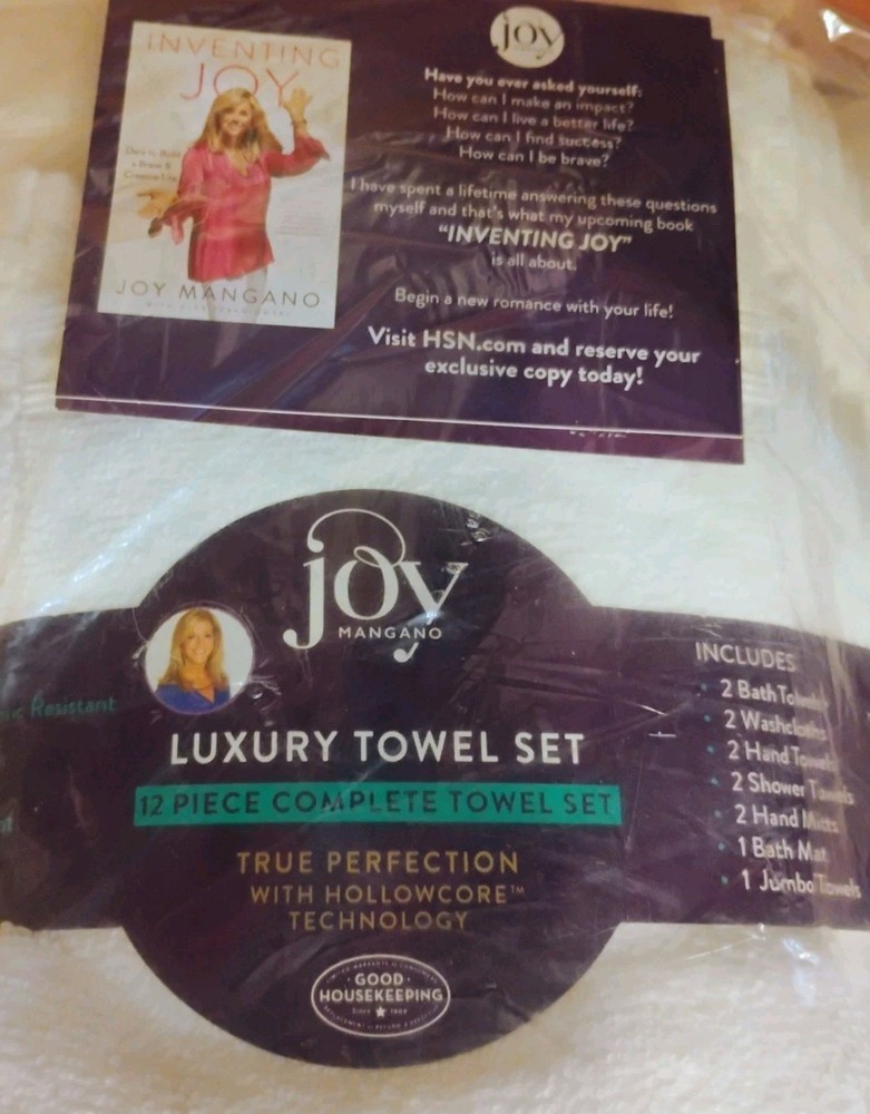 Joy Mangono 12 piece complete towel set. Luxury towel set. True perfection with hollowcore technology. Includes 2 bath towels, 2 washcloths, 2 hand towels, 2 shower towels, 2 hand mitts, 1 bath mat, 1 jumbo towel. 100% cotton, bleach/cosmetic resistant, plush, lightweight, super absorbent. Care instructions: wash before use, machine wash warm, gentle cycle, wash dark colors separately, tumble dry low, do not iron. If bleaching is desired use 1.5 oz of chlorine bleach with 1.5 oz of detergent. Do not pour bleach directly on towels. PLEASE MAKE AN OFFER ALL REASONABLE OFFERS WILL BE CONSIDERED. Also available for local pickup in Sun City Arizona.