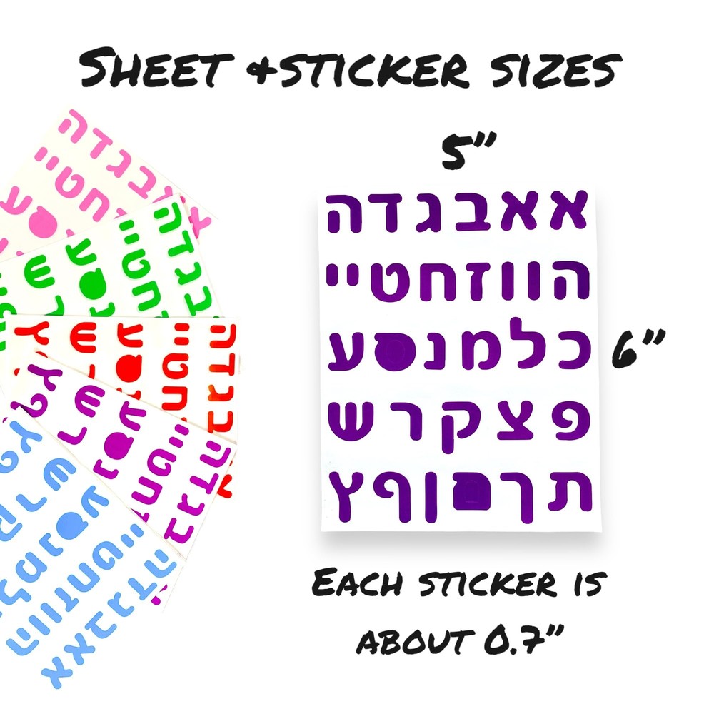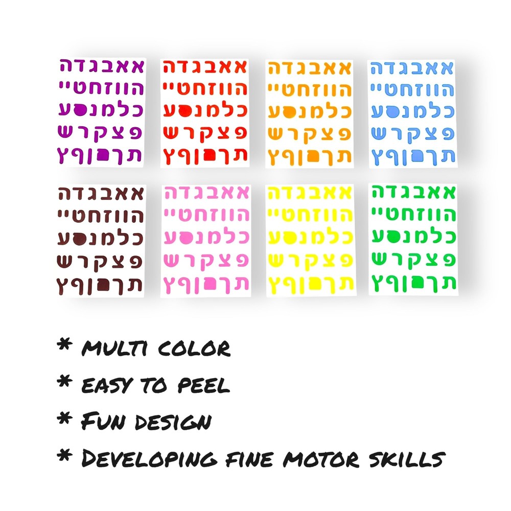 Joyful Artistry Value Package Colorful Hebrew Letter Stickers 8/16/48 Sheets with Over 240/480/1400 Stickers for Kids Learning Hebrew, Hebrew Alphabet Stickers, Hebrew Teaching Materials (8) Over 240 Stickers: Learn Hebrew with our "Assorted Aleph bet stickers for kids" Amazing Assortment: The set includes a total of 8 sheets with over 240 Hebrew alphabet Letter stickers in 8 different colors for learning and decoration. The letters come in the following colors- Blue, Yellow, Purple, Pink, Green, Orange, Red and Brown Perfect for Kids, Toddlers, and Preschoolers: perfect for kids learning hebrew in hebrew school. The kids can stick the Hebrew Letter stickers on paper, notebooks, scrapbooks, water bottles, and different Hebrew arts and crafts projects. Teach kids to recognize Hebrew letters in a fun, easy, hands-on way and help develop fine motor skills Highest Quality: These Hebrew stickers are perfect for learning the Hebrew Alphabet, with high-quality materials that are durable and very easy to apply for young kids Buy Risk Free: We fully stand behind our Hebrew Letter stickers with 100% money-back guarantee. Not satisfied? We’ll send you a quick replacement or issue a full refund. Click ‘Add to Cart’ now to get the fun started risk-free Package includes: Hebrew Letter Stickers in a variety of 8 colors, 8 sheets, and over 240 Stickers for beginner kids learning Hebrew, creating Hebrew cards, and other crafts Function: stickers are perfect for beginner kids learning Hebrew, creating Hebrew cards, and other crafts Easy to use: the Stickers have a strong adhesive making it easy for beginner kids to peel Application: use stickers for Hebrew learning projects, flash cards, art projects, scrapbooks, Hebrew memory game, and as teaching materials for beginner Hebrew teachers and schools Specifications: stickers made from high-quality paper with color variety. Sheet size 5" x 6". Stickers size 0.7" for beginner kids learning the Hebrew alphabet. Shipping from the USA All of our products are shipped from the USA, ensuring quick delivery to your destination. Payment We offer the following payment methods: PayPal, credit card, bank transfer, and eBay's secure payment system. Free Shipping & Free Returns Shipping within the USA is FREE. Additionally, any return is absolutely free for you. Risk-Free Purchase You have the option to return an item within 30 days without any justification. We cover the return shipping costs! Fast Shipping We ship immediately upon receipt of payment. Generally, the package is delivered within 2-3 days in the USA. If it takes longer, we will contact you. Quality and Costs Made in Europe, USA, China No customs fees or additional charges Total satisfaction guarantee Invoice with declared VAT available upon request in .pdf format Feedback Your feedback is very important to us. After you pay for your purchase, you will automatically receive positive feedback from us.