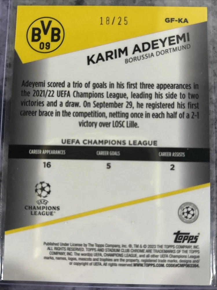 This lot of 25 sports trading cards features players from Borussia Dortmund, including Giovanni Reyna, Jude Bellingham, and Erling Haaland. The cards are from the 2023 Topps Stadium Club Chrome, Match Attax, and 2023 Topps Merlin sets, and were manufactured by Merlin in 2024. Fans of soccer and the UEFA Champions League will love this collection, which includes cards from the 2021-22 season. Whether you're a collector or a fan of Dortmund, this lot is a must-have. These trading cards are a great addition to any collection, and feature some of the most exciting players in soccer. Don't miss out on the chance to own these cards from the 2023 Topps Stadium Club Chrome, Match Attax, and 2023 Topps Merlin sets. Adeymi Stadium Club Chrome Goal Force 18/25.
