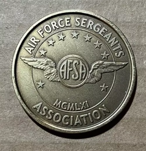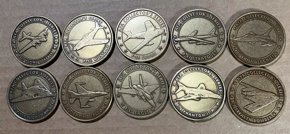 This set of 10 Air Force Association "Collector's Series" collectible coins features the AFA logo on the front side and aircraft designs significant to the USAF on the back side. The coins offer a wide-range of military aircraft covering the time frame from WWII to the modern era making them a unique and desirable addition to any collector's arsenal. Each coin showcases a different aircraft related to the Air Force, making this set a must-have for aviation enthusiasts and military history buffs alike. Coins include the following aircraft: B-17 P-51 F-86 B-47 F-105 F-4 F-117 F-16 F-15 B-2 Also included as a bonus is an "Air Force Sergeant's Association" coin with an F-4 on the back.