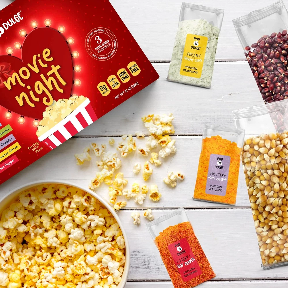VALENTINES DAY MOVIE NIGHT POPCORN KIT: It just takes a little imagination to recreate the romance of your favorite theater at home. Cuddle up with someone special or invite your best buddies over to pop some delicious movie popcorn for a Valentine’s Day movie marathon. Make your favorite flavors, mix and match, and get creative with the best of all foodie gifts and Valentine’s Day gifts for friends. 5 DELICIOUS POPCORN FLAVORS: Make movie magic with 5 mouth-watering, savory popcorn seasonings: Classic Salted Butter, Cheesy Garlic Parmesan, Better White Cheddar, Creamy Dreamy Chive, and Fiery Hot Pepper. Our Valentine’s Day Movie Night Popcorn Set makes it easy to whip up a crunchy cinematic snack in no time. This popcorn seasoning variety pack is the best of all valentine gifts. PACKED WITH FUN: Enjoy gourmet kernels in three different, natural earth tones: Golden Classic, Poppin’ Blue, and Ruby Crunch. Our Valentine’s Day Movie Night Popcorn Gift Set is sourced with the highest quality ingredients in mind. Whether you’re looking for memorable Valentine’s Day gifts for mom, I love you gifts for her, girlfriend gifts, or wife gifts, there’s something for everyone in this tasty popcorn variety pack. A GREAT GIFT: Looking for cute Valentines Day gifts for her? This gourmet, popcorn gift is an exciting way to set the stage — for a fun-filled girls’ night, a romantic couples evening, or a cozy family movie night, wife valentines day gifts, family gifts, foodie gifts. This Valentines Day gift box is a truly thoughtful way to say “I love you.” and a great way to transform an ordinary evening into something special. ALL NATURAL, NON-GMO KERNELS: We care about the quality of our products, because your health matters. That’s why a whole lot of effort goes into ensuring that our food kits contain only the best ingredients and products out there. All our kernels and spices are naturally gluten free, non-GMO, free from trans fats, and sourced from farms in the USA. Get ready for guilt-free snacking! Product Description Pop 'N Dulge Movie Night Popcorn Gift Sets Add to Cart Add to Cart Add to Cart Add to Cart Add to Cart Add to Cart Customer Reviews 4.5 out of 5 stars 2,735 4.7 out of 5 stars 62 3.8 out of 5 stars 18 4.5 out of 5 stars 56 4.4 out of 5 stars 959 4.4 out of 5 stars 959 4.3 out of 5 stars 112 Price $24.98 $ 24 . 98 — $12.98 $ 12 . 98 $21.95 $ 21 . 95 $24.95 $ 24 . 95 — $21.98 $ 21 . 98 Items included 16 20 1 10 10 10 5 Giftable Packaging ✔ ✔ ✔ ✔ ✔ ✔ ✔ Greeting Card ✔ ✘ ✘ ✔ ✔ ✔ ✘ Kosher ✔ ✔ ✔ ✔ ✔ ✔ ✔ Made in USA ✔ ✔ ✔ ✔ ✔ ✔ ✔