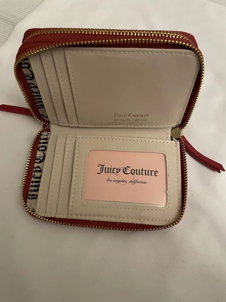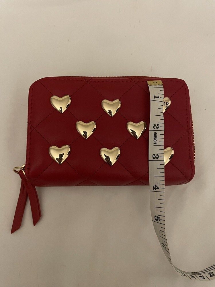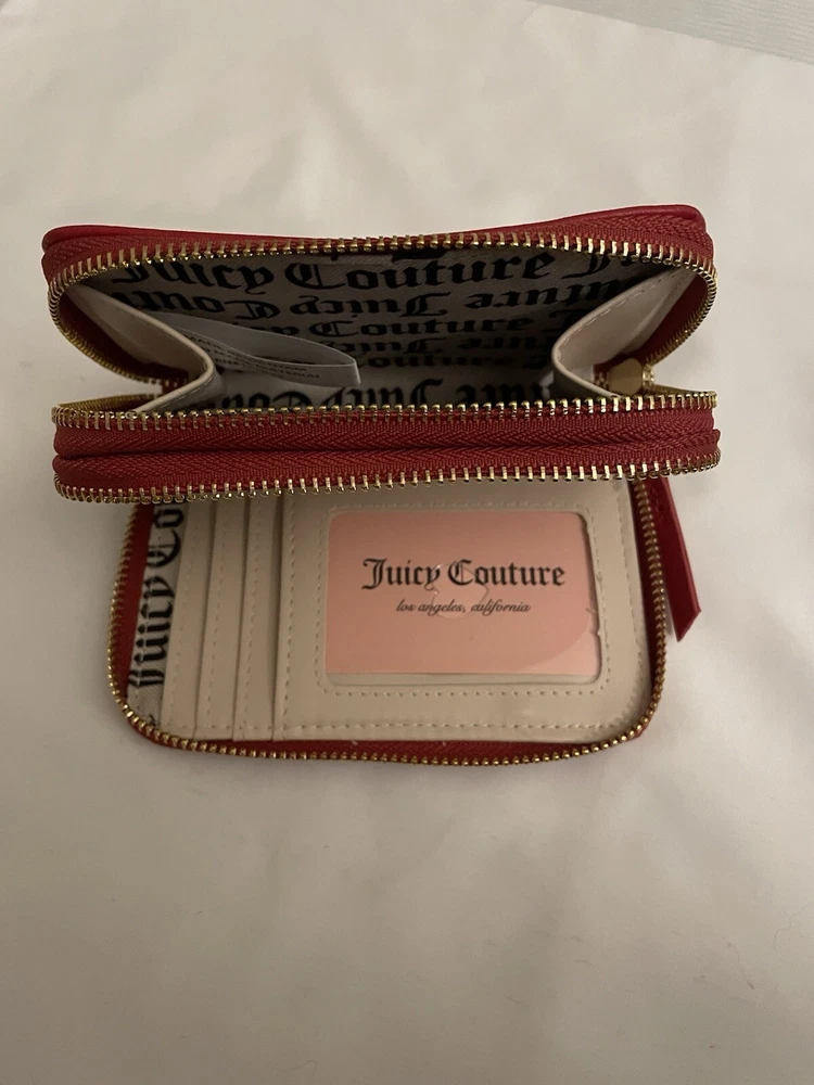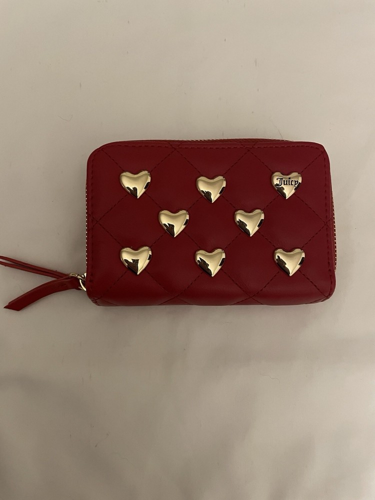 This Juicy Couture wallet is a stylish and functional accessory perfect for any woman. With its vibrant cool red color and solid pattern, it is sure to catch the eye. The wallet features quilted and studded heart accents on the front, along with a logo accent and zipper. It has a double zip around compartment, allowing for plenty of space for credit cards and other essentials. The wallet is made of faux leather with polyester fabric type, and has a folding design with gold tone hardware. The wallet is one size fits all and was manufactured in Vietnam.