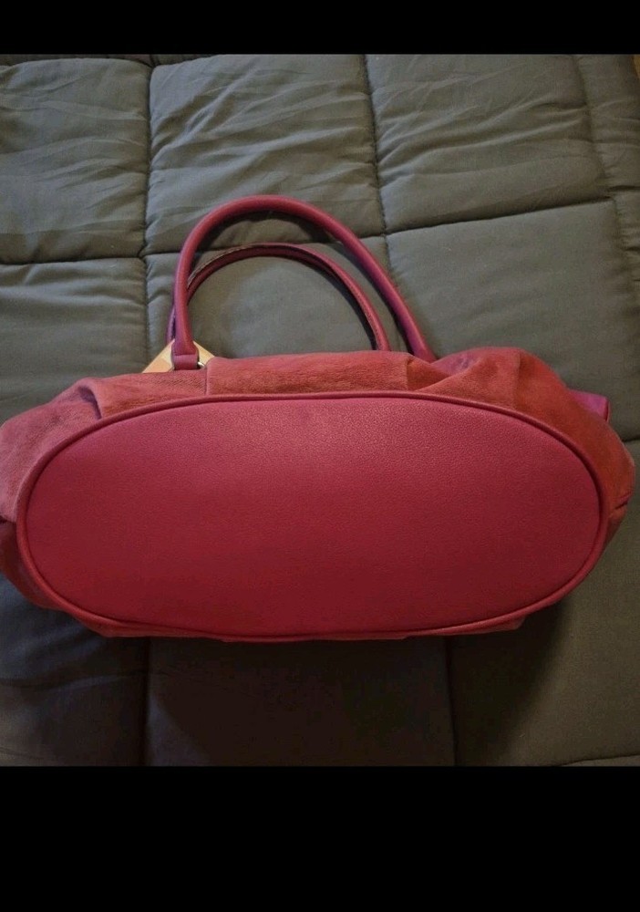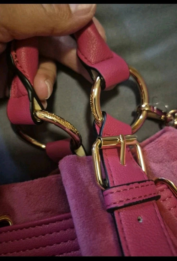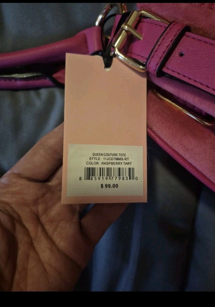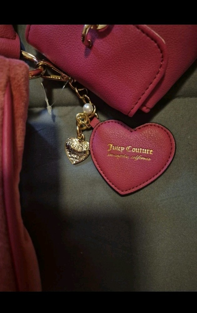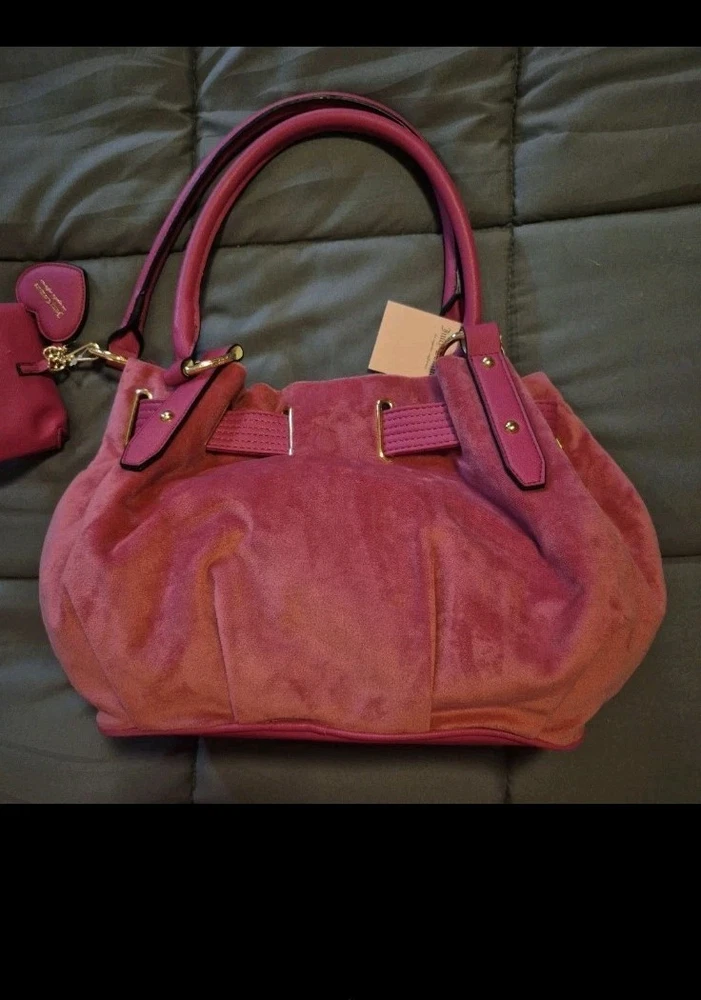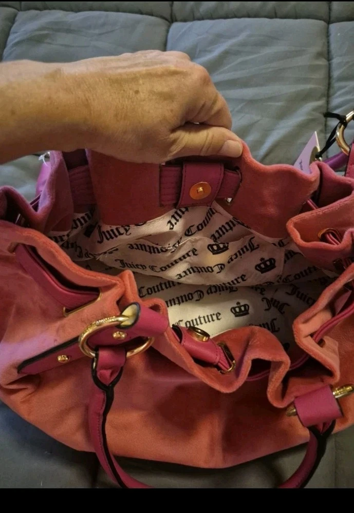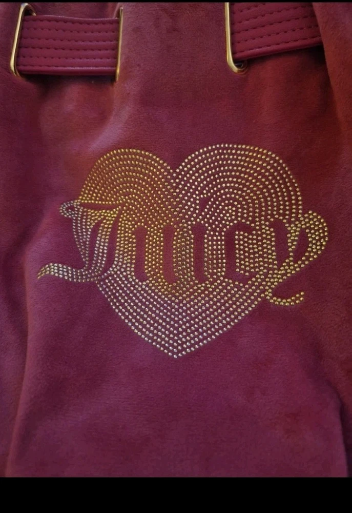 BRAND NEW WITH TAG JUICY COUTURE QUEEN COUTURE TOTE EXCLUSIVE BAG COLOR IS RASBERRY TART HAS ON FRONT JUICY AND A HEART IN GOLD SEQUIN ACCENTS FAUX LATHER AND FAUX SUEDE HAS GOLD HARWARE AND THE RINGS HAVE JUICY COUTURE ON THEM HAS DETACHABLE COIN PURSE AND ALSO HAS PINK HEART AND CHARM AND GOLD HEART CHARM WITH CRYSTAL RHINESTONE AND JUICY COUTURE IN IT SNAP CLOSURE INSIDE HAS ONE ZIP POCKET AND 2 POUCH POCKETS INSIDE LINING HAS JUICY COUTURE WRITTEN THROUGHOUT IT. MEASURES APPROXIMATELY 17' L ร 11' H STRAP DROP IS APPROXIMATELY 10 ' THIS IS A STUNNING BAG