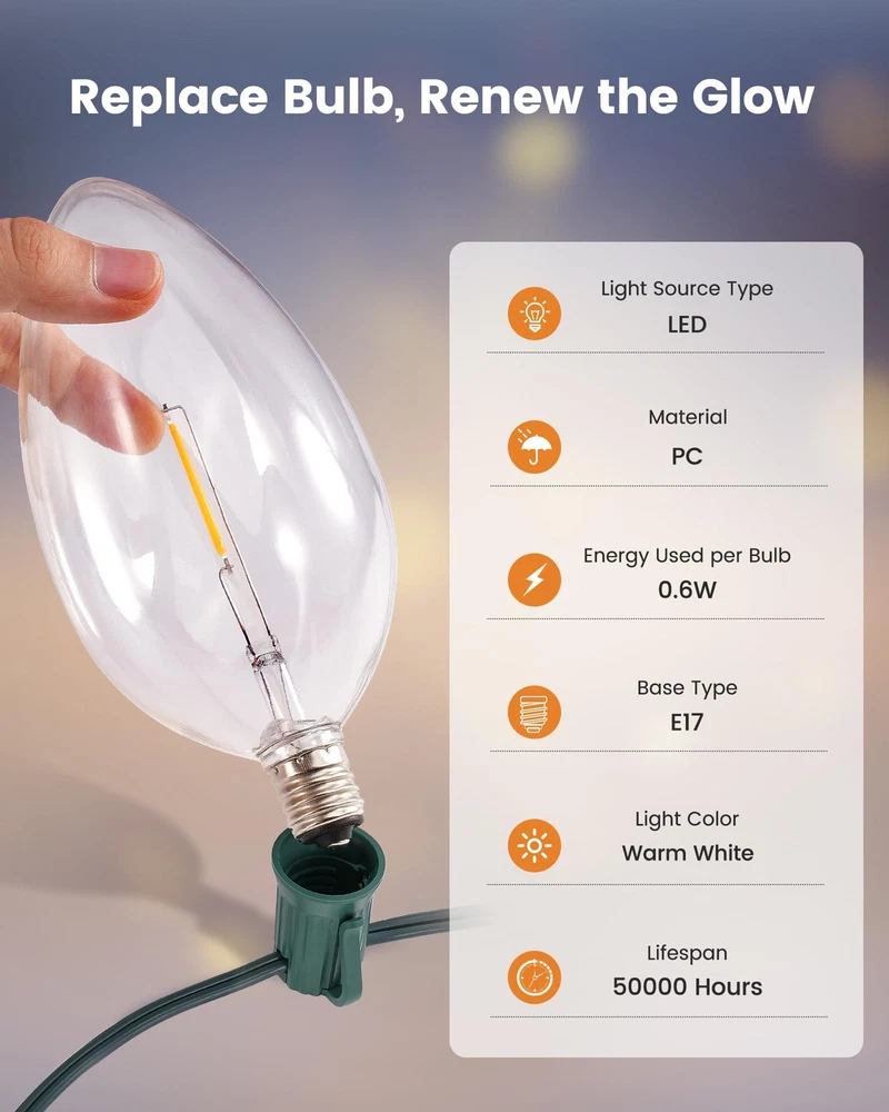 Illuminate your festive season with our Jumbo C9 Christmas Pathway Lights. Stretching an impressive 20 feet, this enchanting display features 10 large, vibrant C9 LED bulbs, each equipped with an E17 base, ensuring a stunning visual impact for any outdoor setting. Our pathway lights are not only a feast for the eyes but also designed for maximum energy efficiency. These warm white lights will transform your driveway, walkway, sidewalk, and yard into a beautifully lit winter wonderland. With a UL Listing for safety and reliability, you can confidently connect up to 72 strands end-to-end, allowing for seamless integration into your existing holiday décor. The package includes 10 sturdy ground stakes, making setup a breeze whether you choose to stake them down or hang them up. Constructed from all-weather resistant PC material, these outdoor lights are built to withstand the elements, making them an ideal choice for Christmas yard decorations and general outdoor Christmas décor. Perfect for decorating houses, roofs, trees, or paths, the Jumbo C9 Christmas Pathway Lights are sure to create a magical holiday atmosphere for your family and friends. Elevate your outdoor Christmas decorations with our Jumbo C9 lights—where size, color, and quality meet to deliver a spectacular festive experience! Vibrant Holiday Glow: Light up your outdoor space with 20FT of Jumbo C9 Christmas pathway lights. Giant warm white LED bulbs are perfect for making your yard, driveway, and walkways festive and welcoming this Christmas Energy-Saving LEDs: The giant Christmas lights are equipped with 10 jumbo C9 LED bulbs, providing bright, eco-friendly lighting, using less electricity so you can enjoy a stunning holiday display without worrying about your energy bill Easy Setup for Christmas Decor: The outside Christmas lights include 10 durable 11.5" ground stakes for fast installation. Whether lining sidewalks, driveways, walkways, or hanging on your roof or trees, setting up your holiday lights is a breeze. Suitable for any Christmas lights with an E17 socket Built for Any Weather: Made with tough PC materials, these Christmas lights outdoor are weather-resistant and built to handle snow, rain, or wind, so your decorations stay bright all season long. These big Christmas lights are perfect for indoor and outdoor use Connect for a Dazzling Display: UL Listed and designed for convenience, you can connect up to 72 strands of driveway Christmas lights end-to-end, making it easier than ever to create a dazzling, uninterrupted Christmas yard display