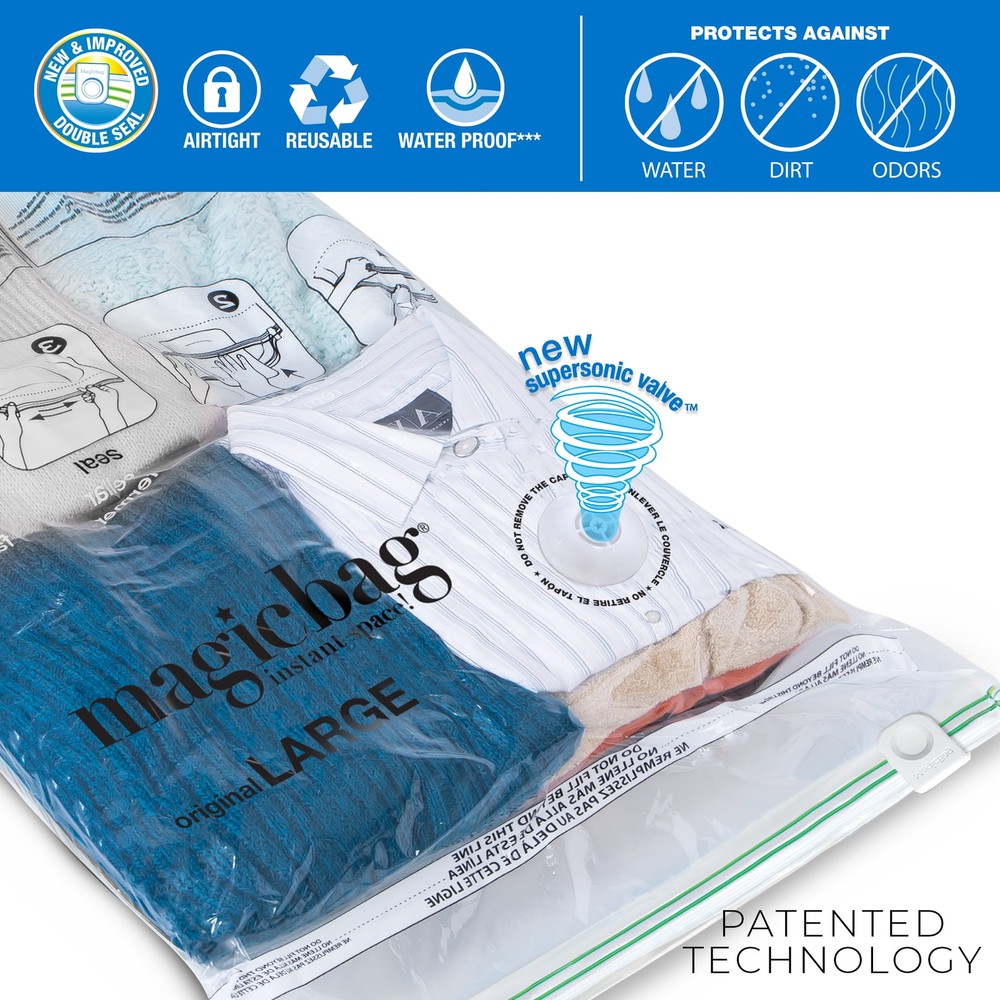 Smart Design Pack items inside , zip up bag with the easy grip slider, vacuum out air, and store it. Your items will remain airtight and protected from season to season. Package Includes Airtight one way valve fits almost all vacuum hoses and does not allow air back in. Double zipper acts as a safety for an airtight seal. For seasonal clothing, sports garments, jackets, sweaters, comforters, bedding, pillows, & bulky items. Features & Benefits are reusable and create 3 times more space in your closet, under your bed, in your garage, and just about anywhere. Keeps your clothes and linens airtight and protected from water, dirt, & odors. Product Specifications Dimensions: Original: 21.65(L) x 0.1(W) 33.5(H) inches; Tote: 25.5(L) x 19.75(W) x 10.5(H) inches Bag Count: 5 Bags Size: Large Included Holds: Each Bag Holds 10-12 Sweaters Color: Clear Material: Airtight Resin Polymers Design: Patented Airtight Seal Free Up More Space - Space Saver bags create 3X more space in your closet, under your bed, or in storage bins by compressing your linens Keep Your Items Protected - Patented space saving material that squeezes air out and seals against dirt, odor, water, and dust Stays Airtight - Easy-grip double zipper design keeps items safe with a waterproof seal. Lab tested to stay airtight and withstand the elements Seal and Store - Vacuum airtight one-way valve fits almost all vacuum hoses and does not allow air back in, keeping your valuables packed tight DIMENSIONS - 21.65 x 33.5(OL) inches; 25.5 x 19.75 x 10.5(tote) (L x W x H) Package Includes Airtight one way valve fits almost all vacuum hoses and does not allow air back in. Double zipper acts as a safety for an airtight seal. For seasonal clothing, sports garments, jackets, sweaters, comforters, bedding, pillows, and bulky items. Features and Benefits are reusable and create 3 times more space in your closet, under your bed, in your garage, and just about anywhere. Keeps your clothes and linens airtight and protected from water, dirt, and odors. Product Specifications Dimensions: Original: 21.65(L) x 0.1(W) 33.5(H) inches; Tote: 25.5(L) x 19.75(W) x 10.5(H) inches Bag Count: 5 Bags Size: Multiple Sizes Included Holds: Each Bag Holds 10-12 Sweaters Color: Clear Material: Airtight Resin Polymers Design: Patented Airtight Seal